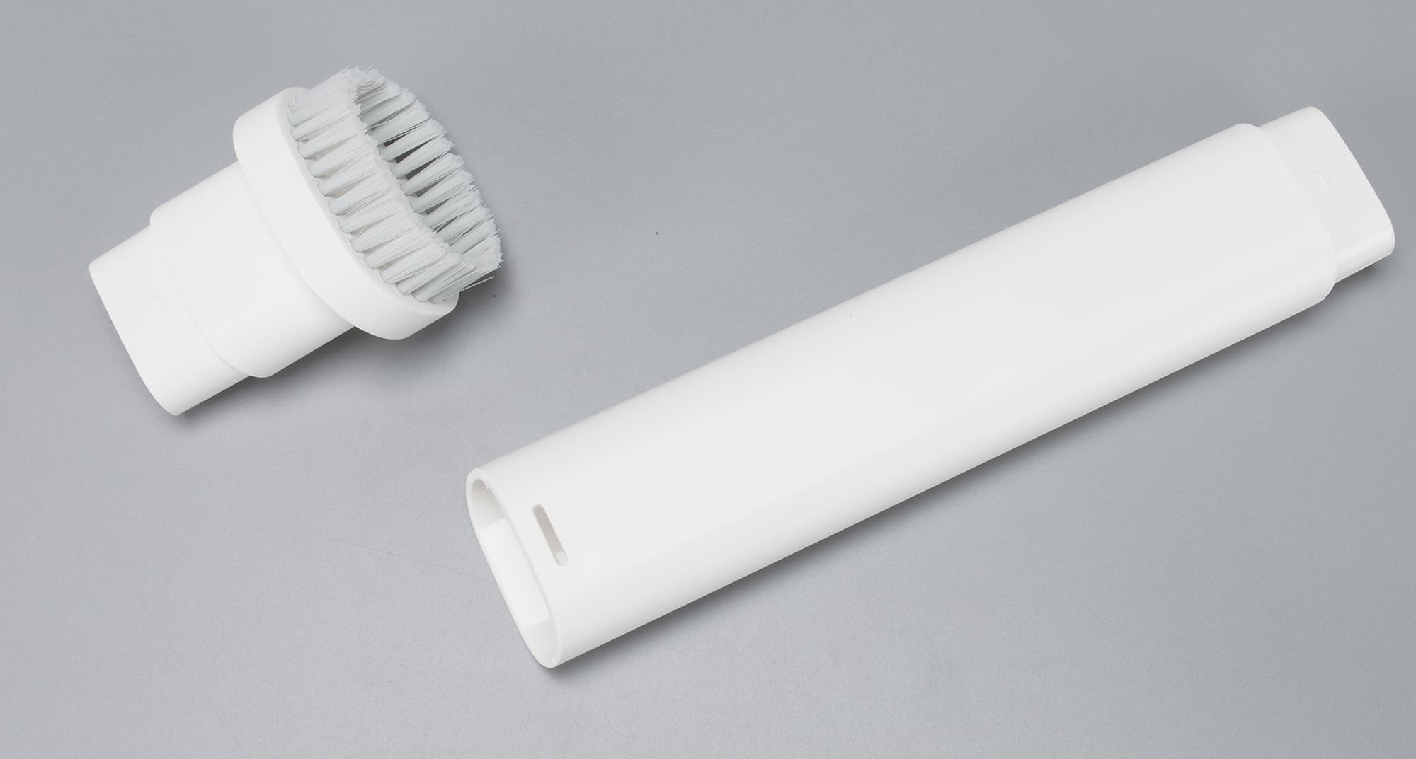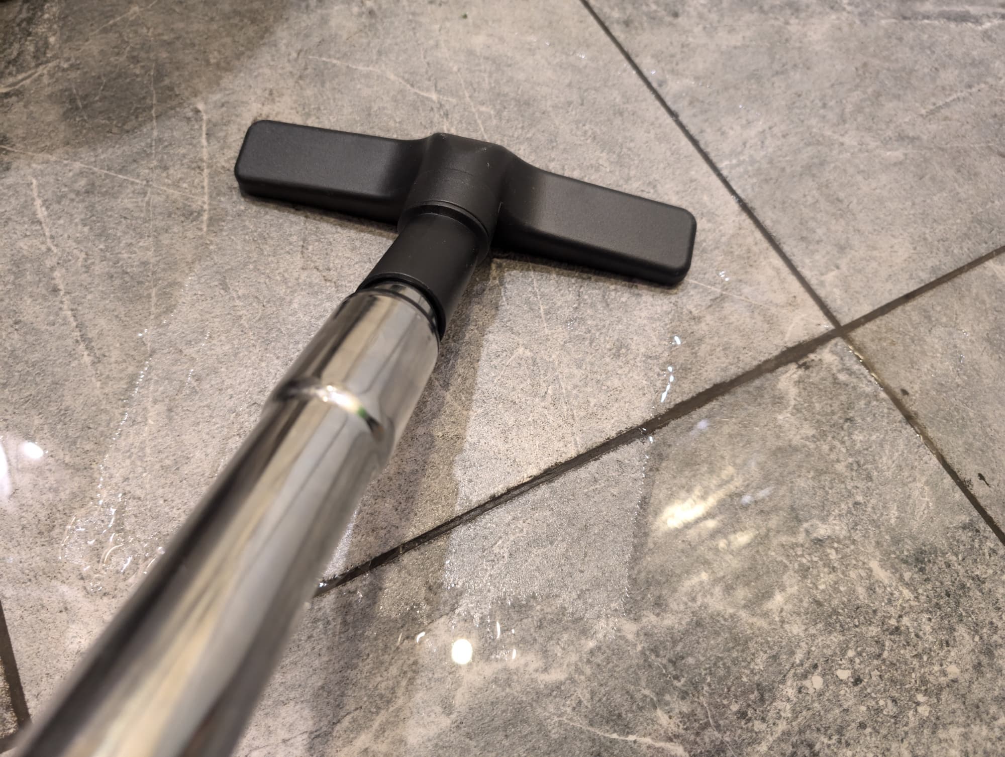 Двойной шланг с силиконовым покрытием соединяет корпус и рабочий инструмент — щетку: по трубке в зону уборки поступают, в зависимости от выбранного режима работы, вода или горячий пар, а через гофрированную трубу в обратном направлении движется поток воздуха, использованной или собранной воды и грязи. Щетка разборная, ее чистящий модуль можно снять и промыть.