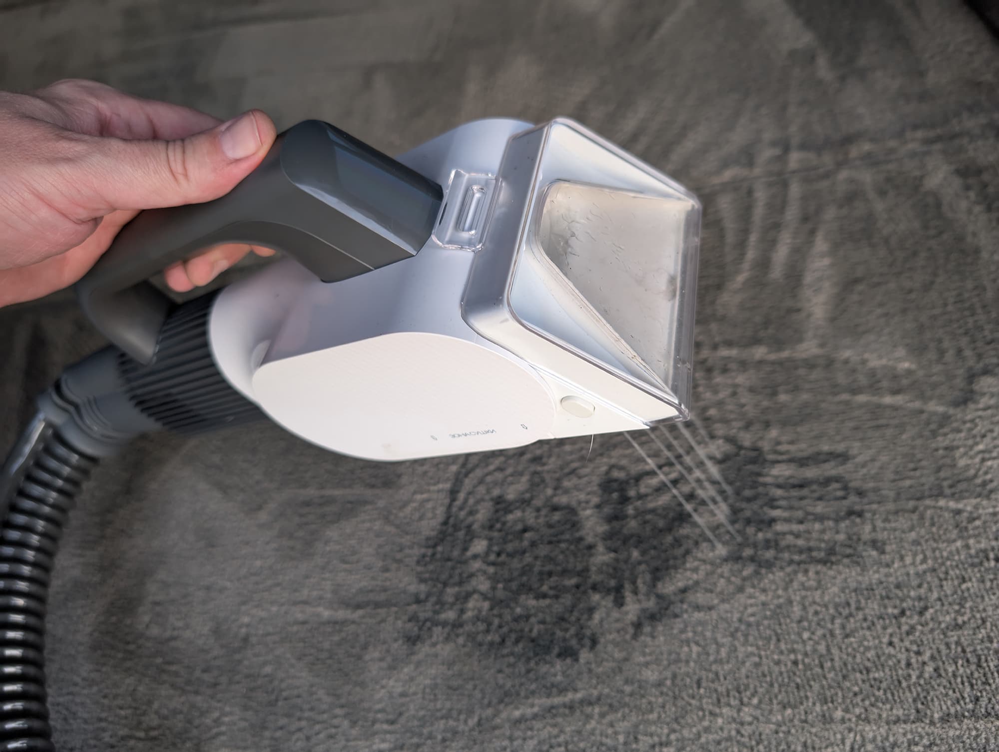 Во время тестирования мы обнаружили, что при очистке любых покрытий щетку лучше двигать на себя: тогда поступающая на них вода обеспечивает глубокую промывку, щетина снимает твердые загрязнения, а влага удаляется вместе с жидкостью через переднее сопло. Мы испытали прибор всех режимах на самых разных покрытиях: обивке салона автомобиля, тканевых автомобильных ковриках, придверных половиках, мягкой мебели и ковролине. Обнаружили пользу режимов горячей воды и паровой очистки — сильно загрязненный текстиль отлично отмылся. Модель можно использовать и в качестве обычного пароочистителя, и даже отпаривателя для вещей. Выявленное ограничения — сравнительно большая щетка затрудняет использование прибора в труднодоступных местах. Ну и естественно, требуется уход за самим прибором: просушивание деталей, периодическая очистка от накипи.