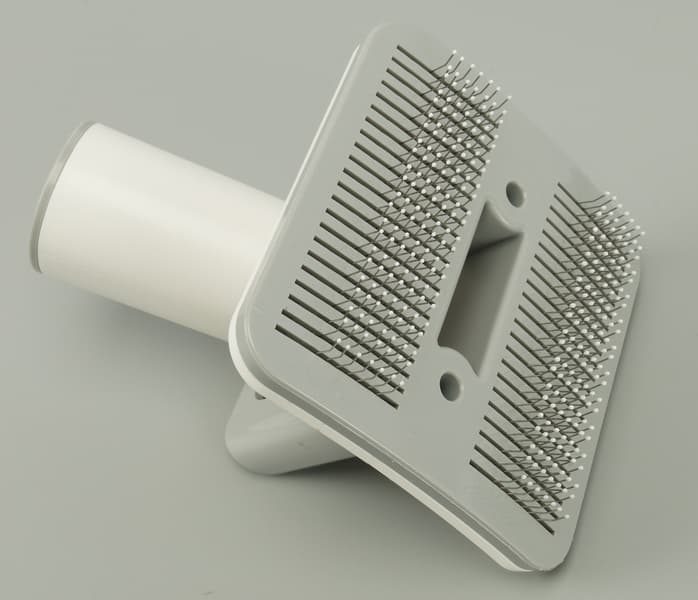 В комплекте мы нашли несколько насадок и триммер. Основные насадки — щетка с короткой щетиной и щелевая насадка для вычесывания, по принципу похожая на фурминатор. Обе справляются со своей задачей: шерсть легко собирается и автоматически уходит в контейнер, а кнопка сброса позволяет сразу очистить щетку без лишних движений. При тестировании на диване и пледе шерсть была собрана практически полностью за один проход.