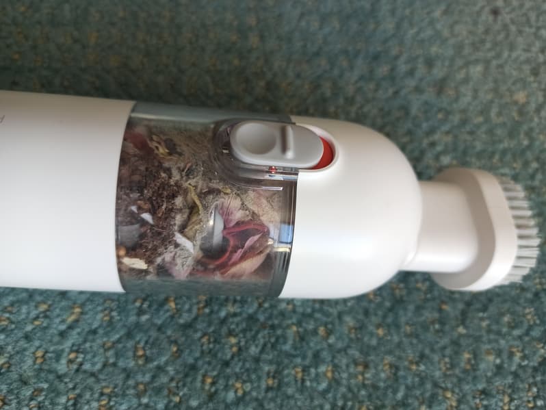 Мы тестировали модель сначала с насадкой со щеткой, собирая мелкий сор и пыль по квартире. Начали с клавиатуры компьютера, затем убрали крошки под столом и с обивки дивана, мелкий сор с пола в рабочей зоне кухни, избегая влажной грязи, собрали пыль на полках, полочках и молдингах, прошлись по корешкам и обложкам книг и книжным полкам. Мягкая щетина насадки позволяет свободно маневрировать по изгибам выдающихся настенных декоративных элементов, эффективно подхватывались мелкий сор, крошки и пыль. В режиме турбо собрали песок с пола в прихожей. За счет малого веса и портативности модели процесс шел быстро и без дискомфорта. В обычном режиме пылесборник у нас заполнился за 30 минут — и как раз аккумулятор разрядился. Второе тестирование проводили уже в салоне автомобиля в режиме турбо и с щелевой насадкой - обещанные 9 минут автономной работы пылесос выдерживает, и даже на 40 секунд больше. Мощность всасывания, согласно нашим измерениям, составила 32 аВт в режиме «турбо» и 9 аВт в обычном, и для такого малыша 32 аВт, с нашей точки зрения — достойный результат.
