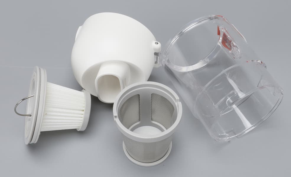 Весит этот малыш без насадок всего 470 г и имеет габариты 26,7×5,5×5,5 см, не больше сложенного зонтика-автомата. Пылесос приятный на ощупь, легкий и компактный, держать в руке его удобно и приятно. Все детали продуманы и сборка безупречна: все подогнано, ничего не люфтит, все открывается, снимается, надевается, нажимается без проблем. Есть подсказки для пользователя: например, на внешнем сетчатом фильтре маркировка подсказывает направление движений при его сборке — минимум движений и усилий. Пылесос включается, выключается, переключается из режима в режим (их два) единственной кнопкой.