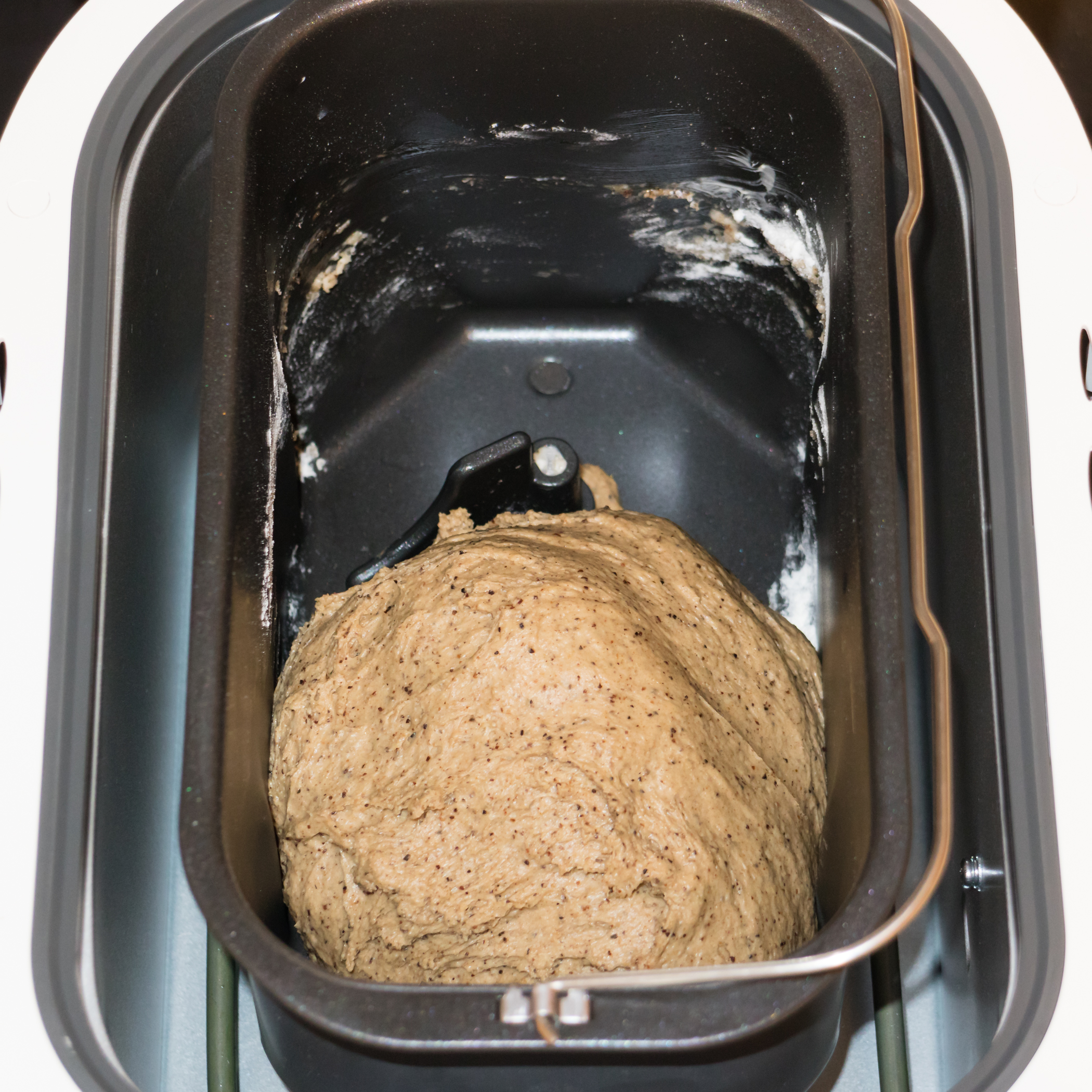 После 15-минутной паузы мешалки начали свою работу. Мы вновь восхитились силой и скоростью их работы: буквально через три минуты между лопастями перекатывался ком почти гладкого дрожжевого теста. Замес продолжался, тесто становилось все совершеннее. Оставили прибор в покое и вернулись лишь тогда, когда раздался сигнал о добавлении дополнительных ингредиентов. Всыпали семена и закрыли крышку.