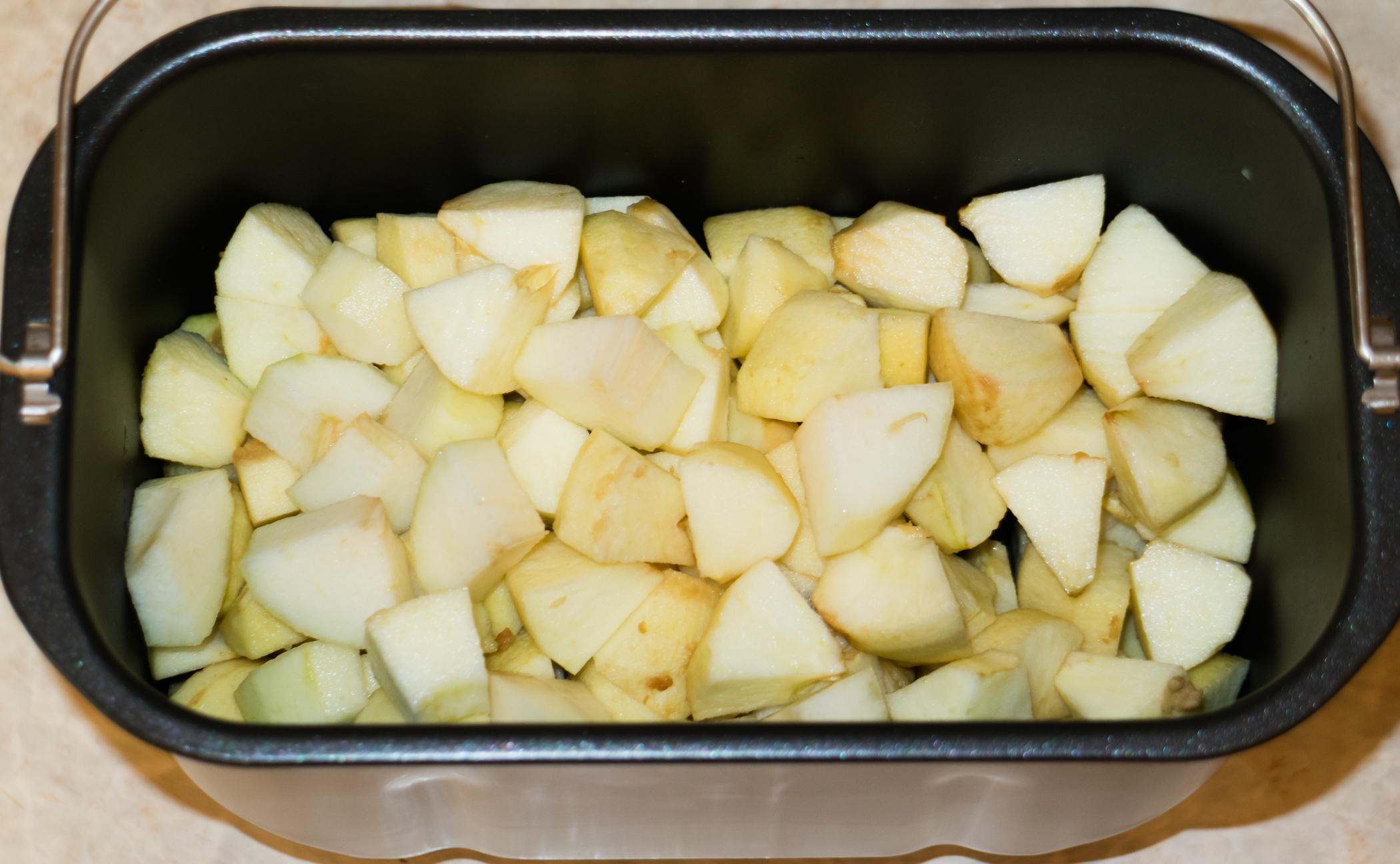 Поставили форму для выпечки с содержимым в хлебопечь и задали программу под номером 11 «Варенье» и отсрочку процесса на полтора часа. За это время плодовые дали сок, так что когда процесс варки начался, в чаше уже было чему кипеть.