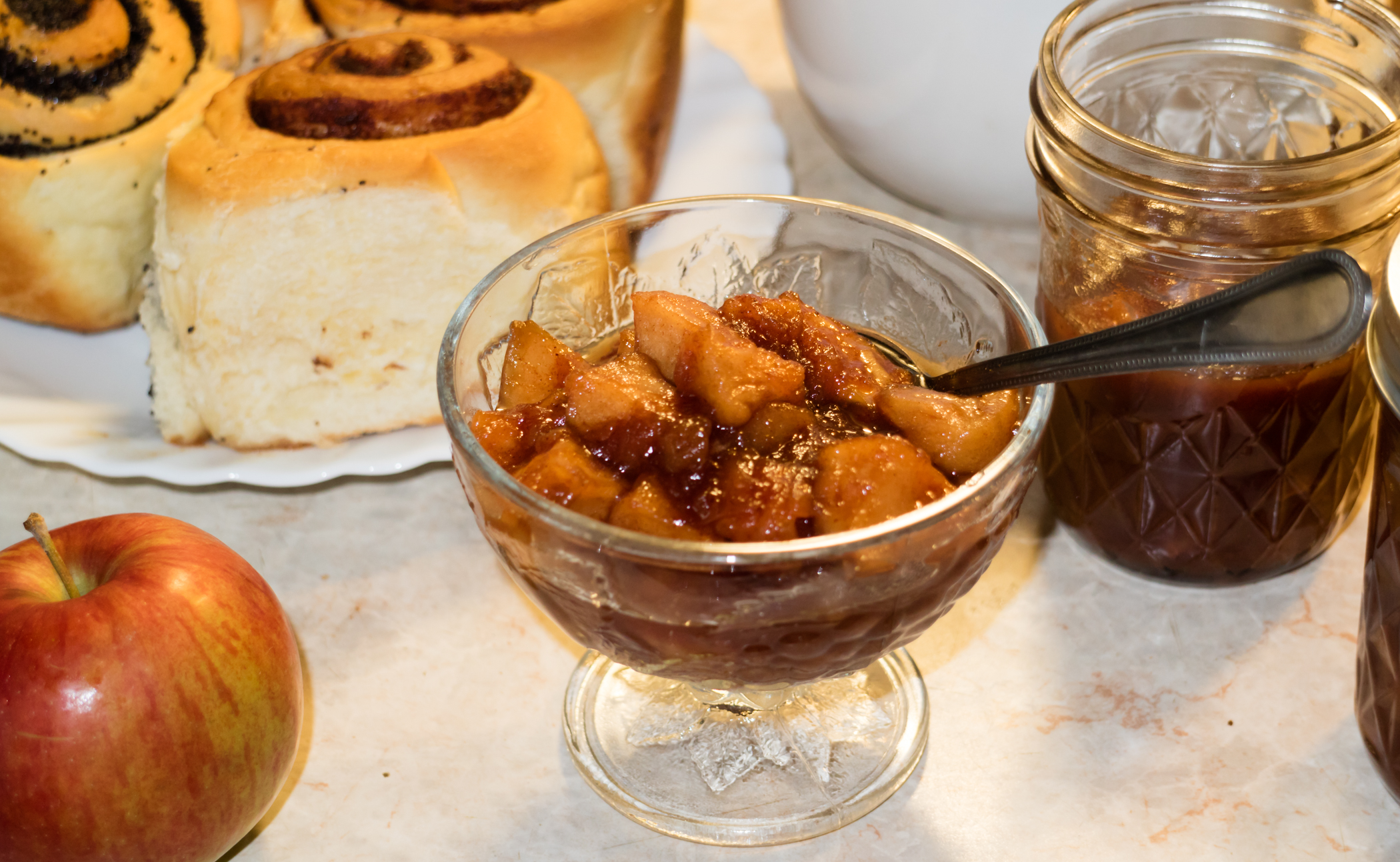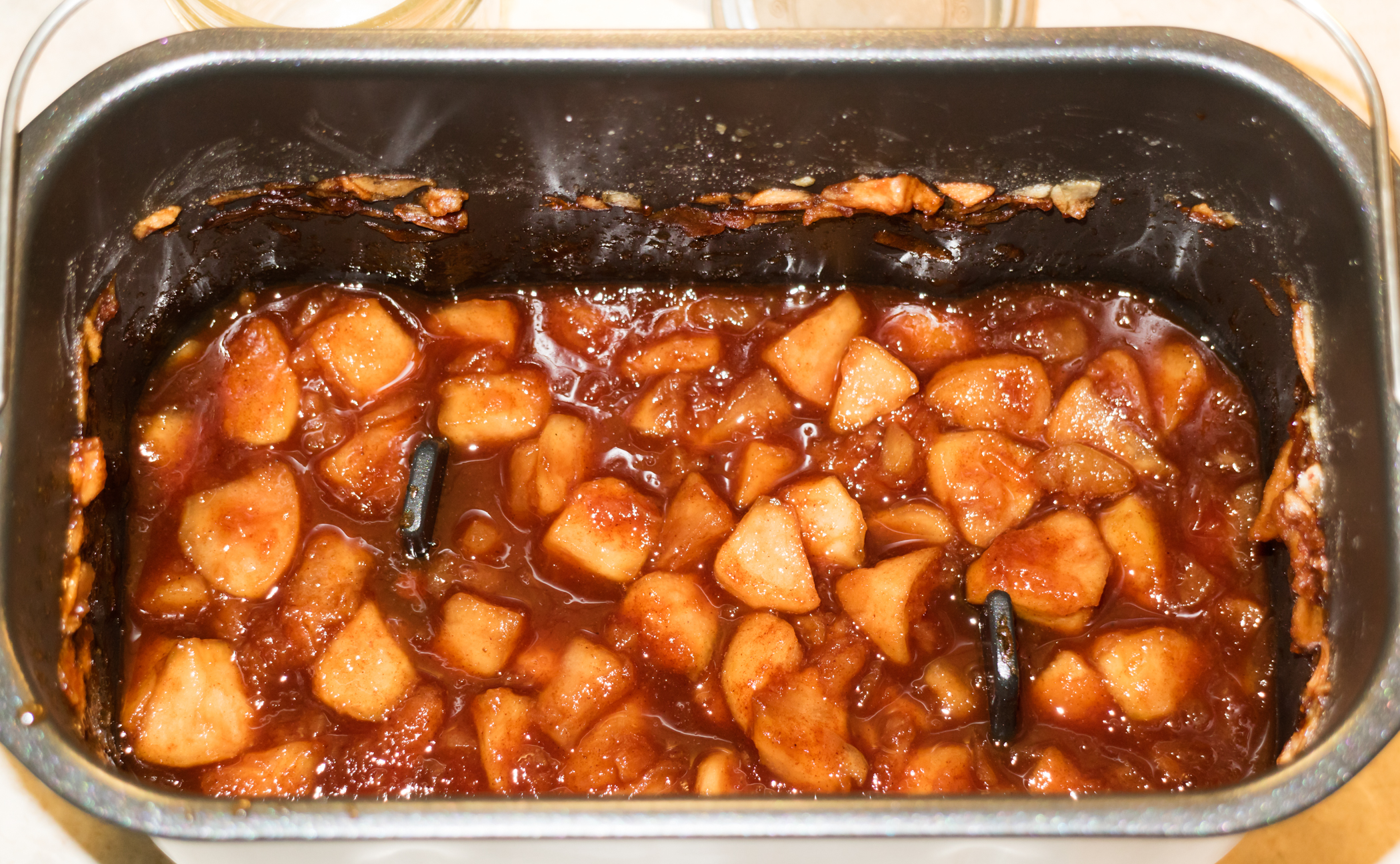 Всего цикл варки продолжался 1 час 20 минут. Когда он завершился, мы осмотрели результат. Нам показалось, что яблоки сварены недостаточно, поэтому задали цикл повторно. Заодно добавили пару ложек молотой корицы.