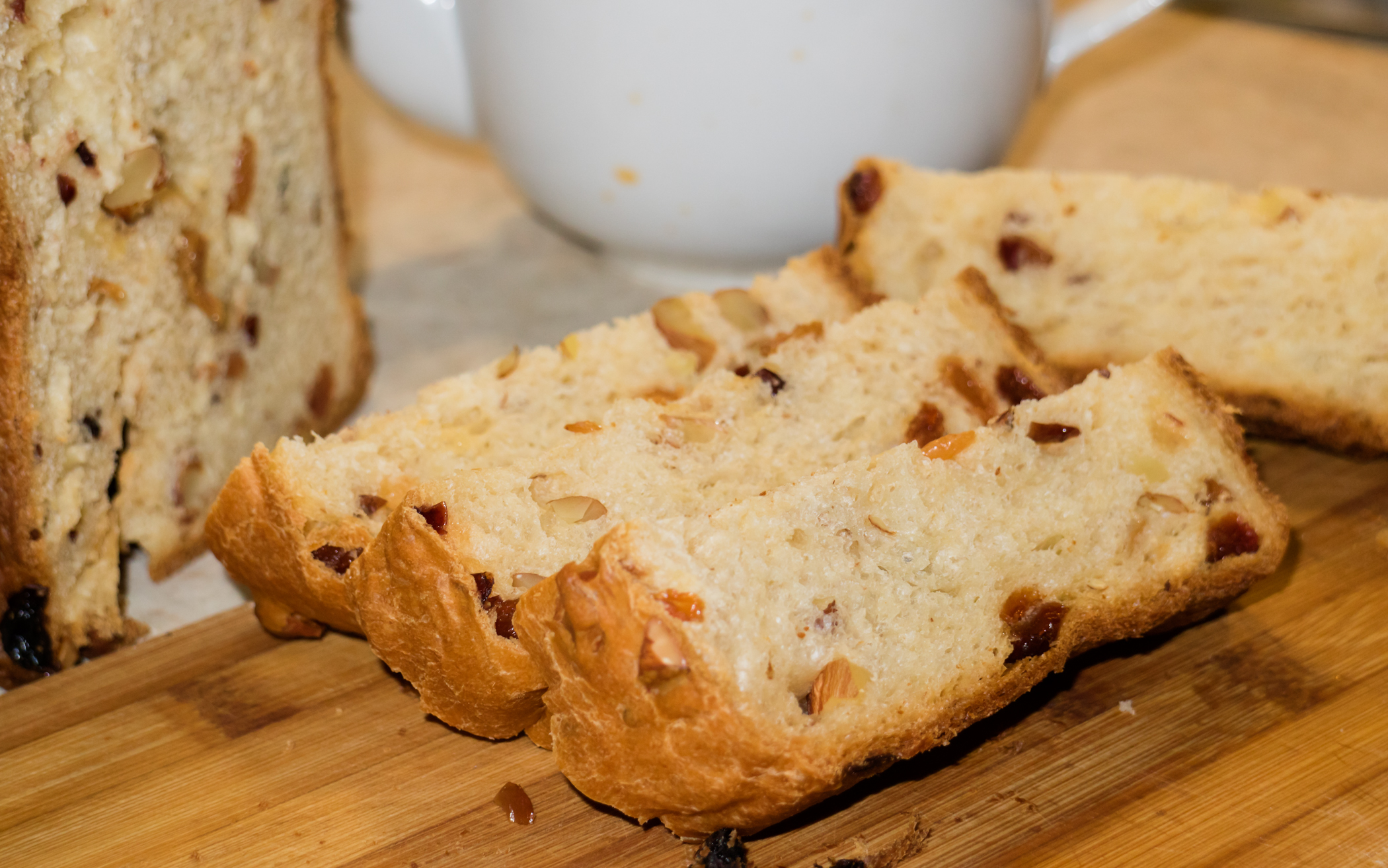 Растворили дрожжи в теплом молоке, добавили ванильный экстракт, масло, соль, сахар и муку. Запустили восьмую программу, которая называется «Сливочный хлеб». Тесто по окончании первого замеса получилось мягкое, гладкое. Когда раздался сигнал о добавлении дополнительных ингредиентов, мы всыпали порубленный миндаль, вяленую клюкву, вымытый и предварительно немного замоченный в воде изюм. В сухофрукты перед добавлением в форму всыпали примерно полторы ложки муки и хорошо встряхнули, чтобы каждая ягода со всех сторон была обсыпана мукой — так они равномернее распределятся по всему объему теста.