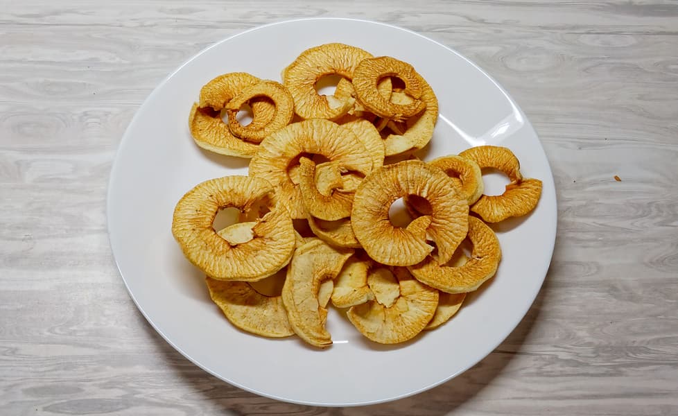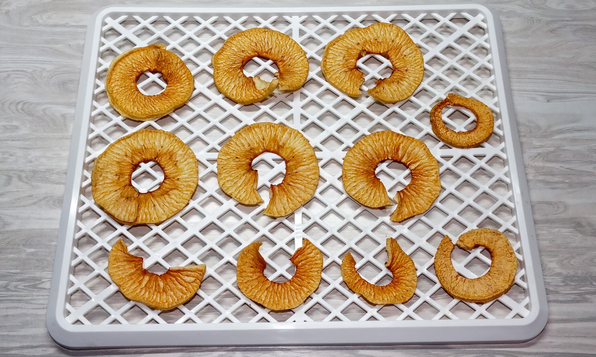 Ну а если увеличить время сушки до 8 часов, то яблоки засушатся до ломкого состояния — в таком виде их можно убирать на длительное хранение.
