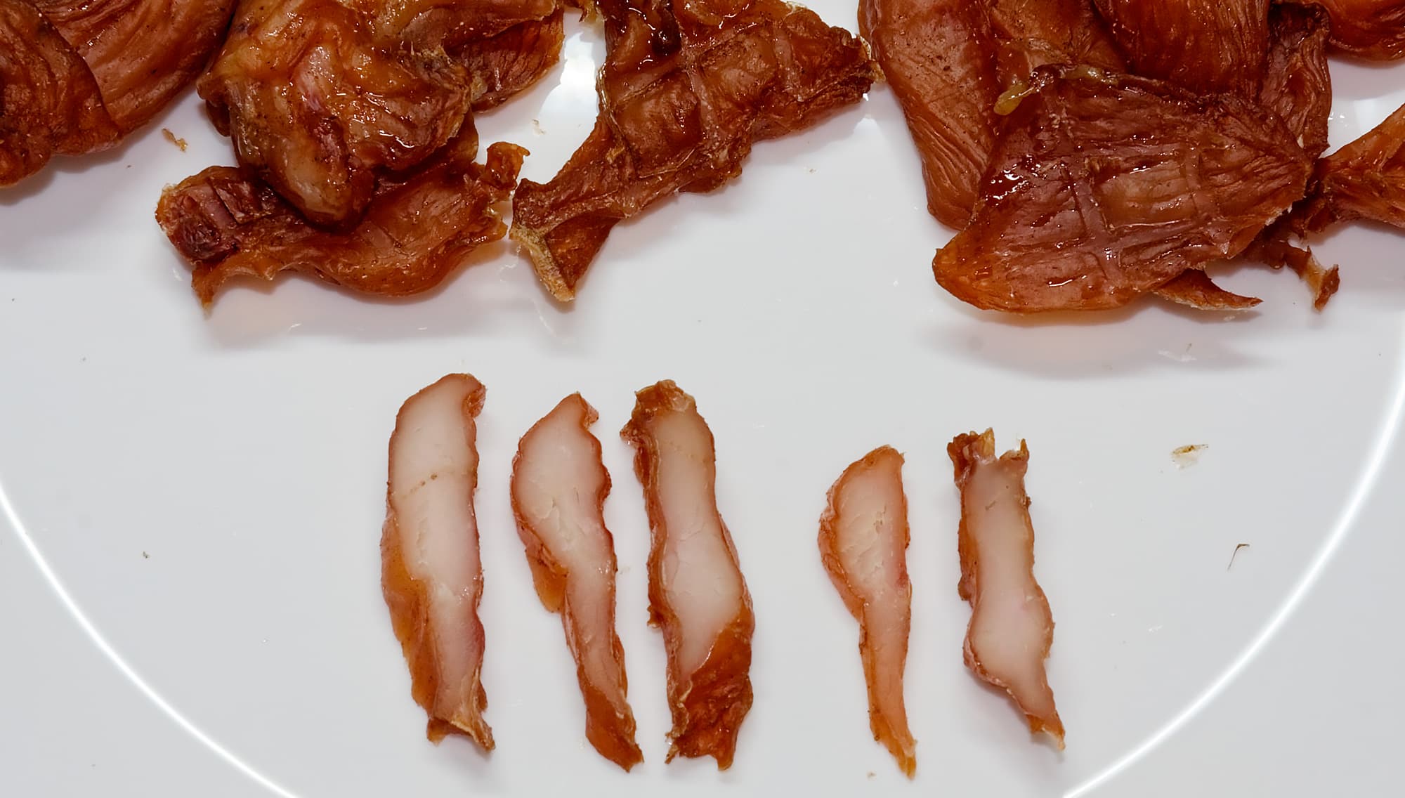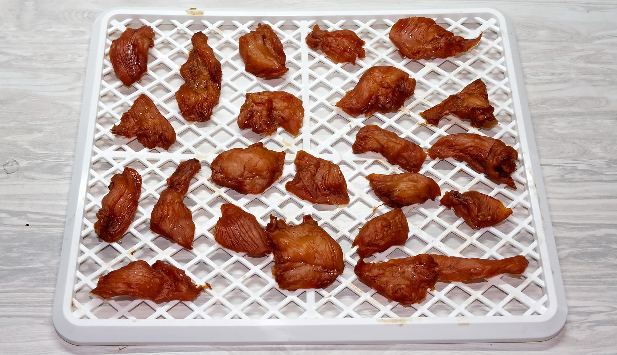 Обратите внимание на срез: приготовленные таким образом джерки оказываются не ломкими, мягкими внутри — их легко нарезать ножом или кухонными ножницами, и довольно легко прожевать.