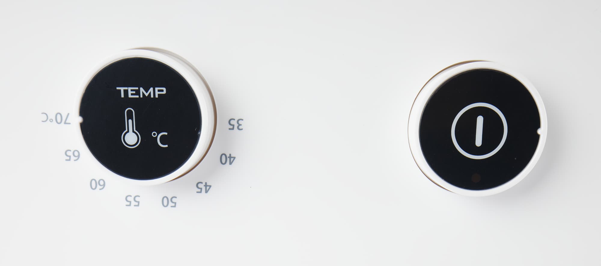 Прибор оснащен одной механической кнопкой (вкл./выкл.) и одной механической ручкой, отвечающей за установку нужного температурного режима. Небольшой нюанс — если устанавливать температуру, близкую к максимальной, то надписи на ручке окажутся перевернутыми.