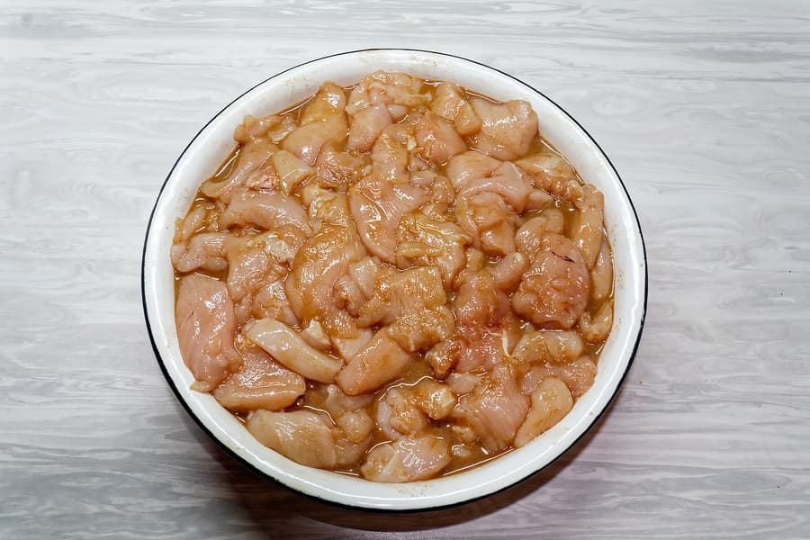 Куриная грудка, как эталонный образец, была нарезана и замаринована на сутки в готовой смеси приправ для вяленого мяса (набор специй, сахар, нитритная соль).
