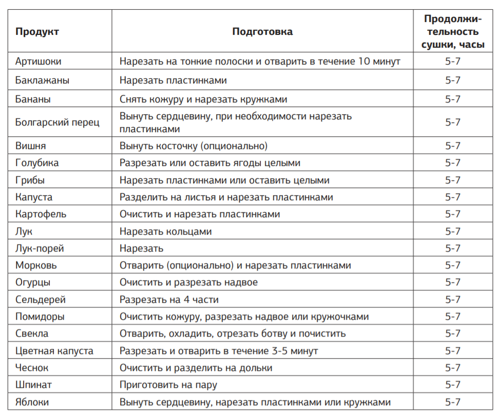 Нашлась тут и таблица продолжительности сушки различных продуктов (правда, составители решили не напрягаться и везде поставили 5-7 часов).