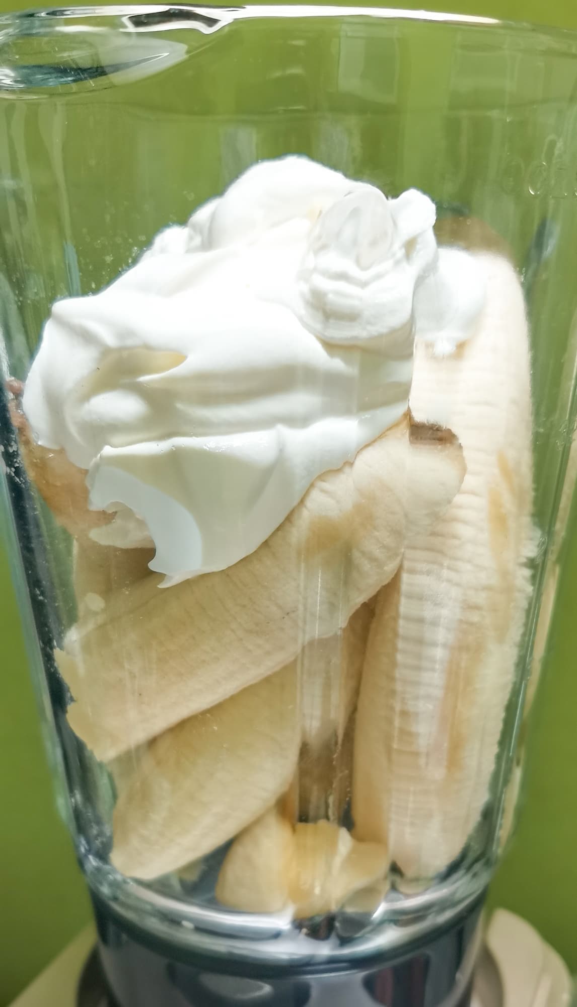 В блендер положили бананы и пачку сметаны. Взбили до гомогенного состояния, в течение примерно 1,5 минут.