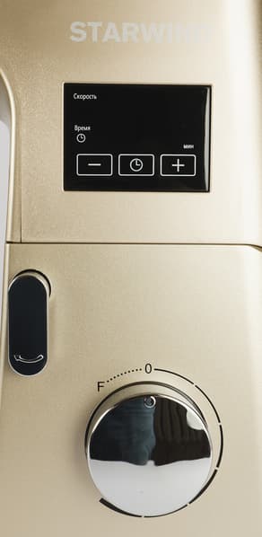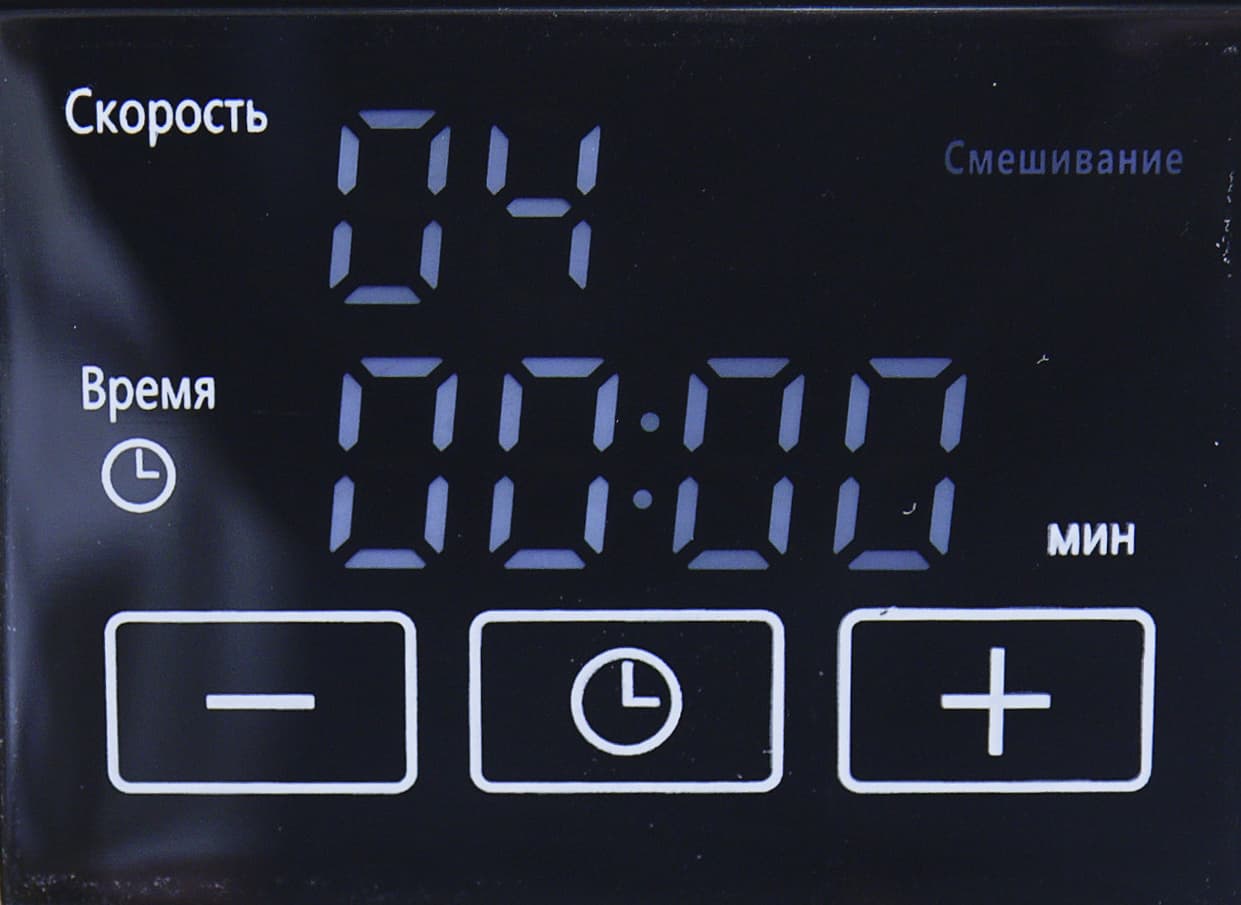 Всё управление прибором сосредоточено на передней стороне и состоит из ручки регулировки скорости и дисплея. Дисплей включится и прибор может начать работу только при опущенном моторном отсеке, закрытых крышках отсеков дополнительного оборудования или при присоединённых к гнёздам насадках. Дисплей включается в программе 0, в которой можно с помощью сенсорных клавиш установить время работы кнопками «+» и «–». Далее, поворотом ручки регулировки скорости запустить вращение со скоростью от 1 до 6 или подогрев чаши – он запускается поворотом против часовой стрелки в положение «F». Время, установленное по умолчанию в программе подогрева 1 час, при вращении – 10 минут. После окончания времени прибор издаст звуковой сигнал и отключится.