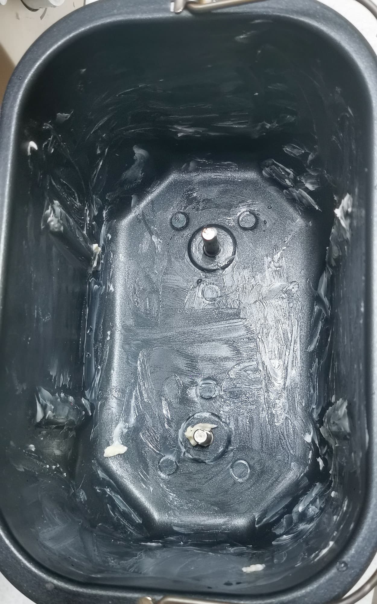 Подготовили форму для хлеба, смазали маслом, выложили тесто, оставили на полчаса для расстойки. Затем выпекли в хлебопечке.