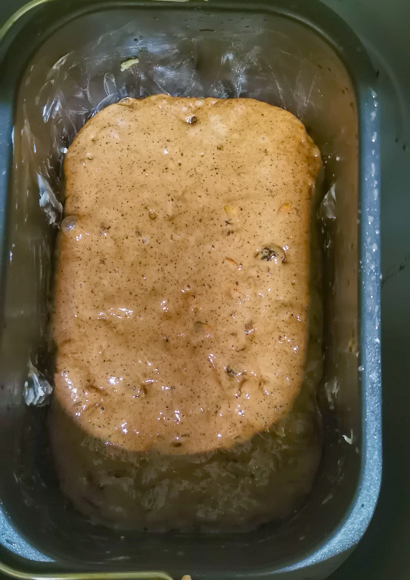 После вымешивания оставили тесто на час в чаше в режиме подогрева. Через час добавили изюм и семечки, оставили подниматься ещё на час.
