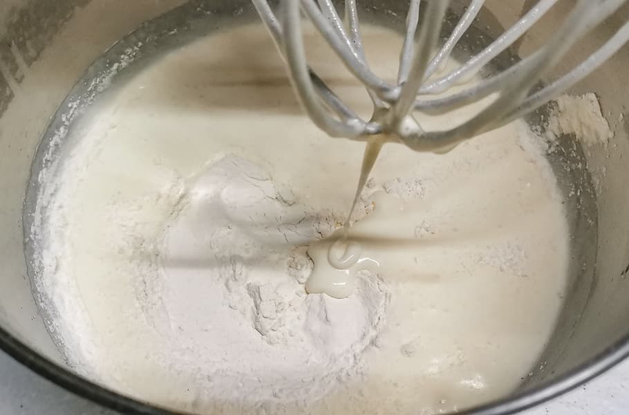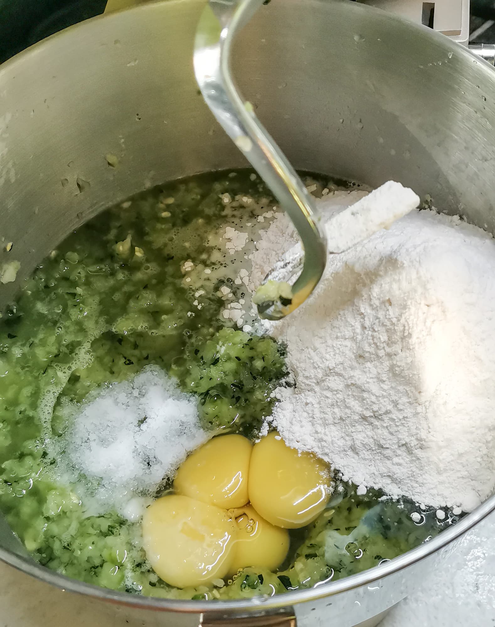 В смесь добавили муку, яйца, соль и вымешали тесто на средней скорости с помощью миксера.