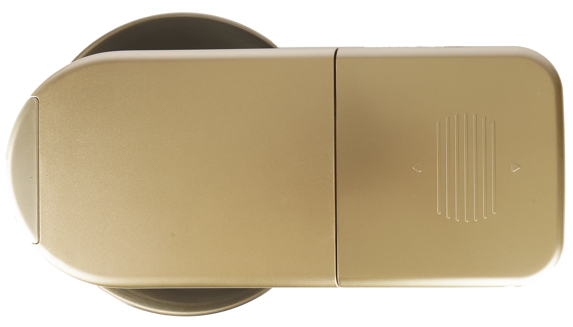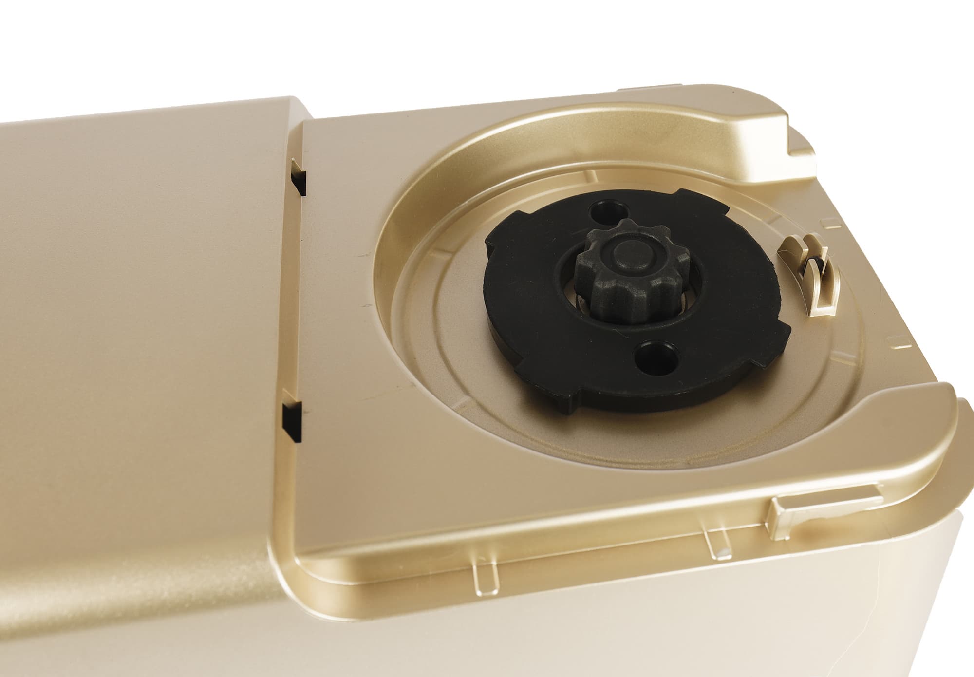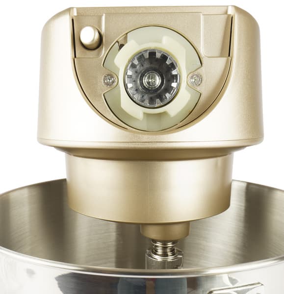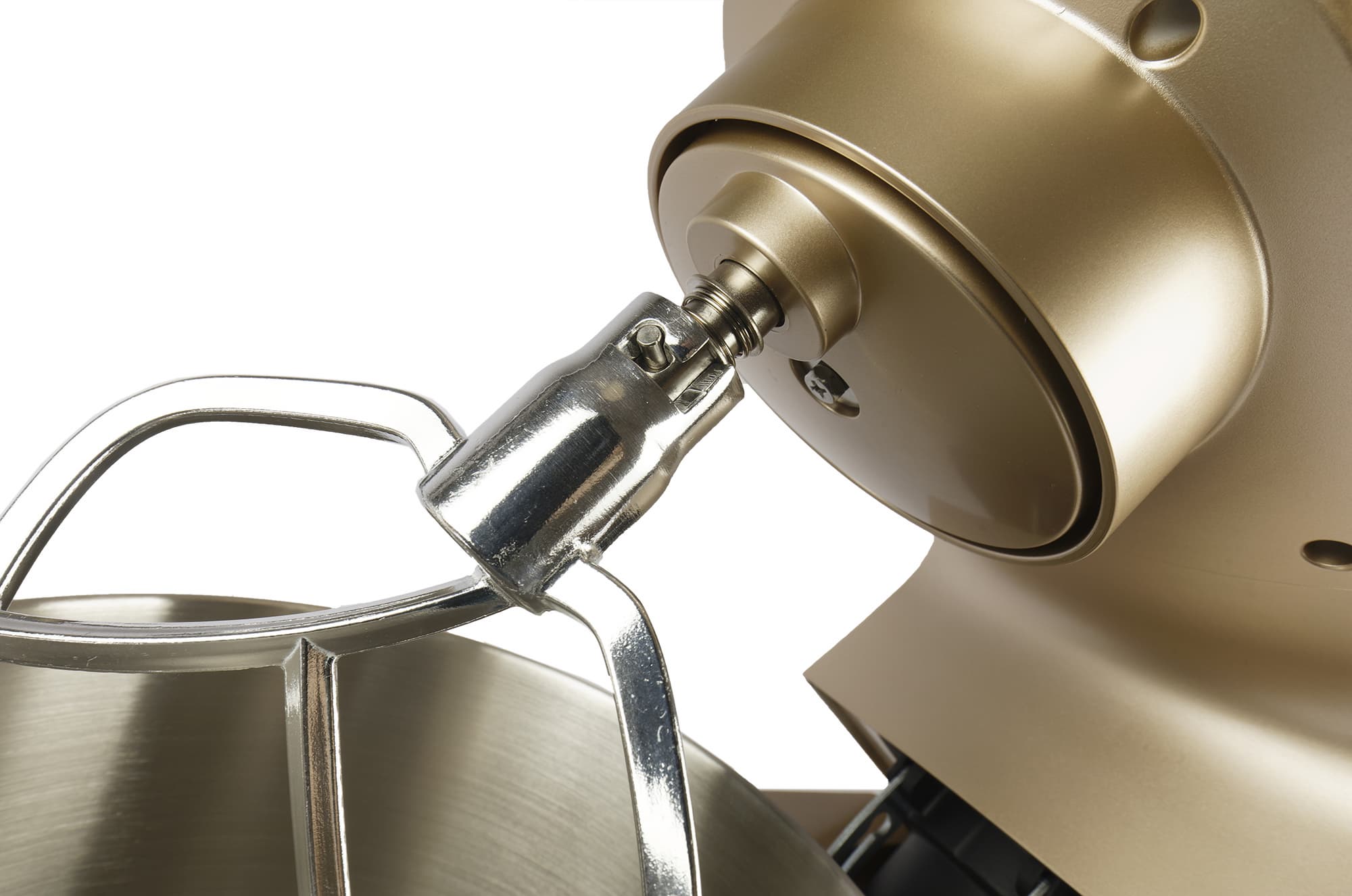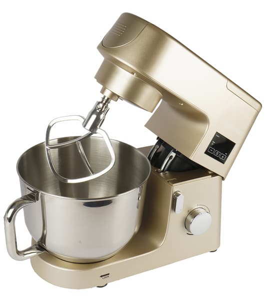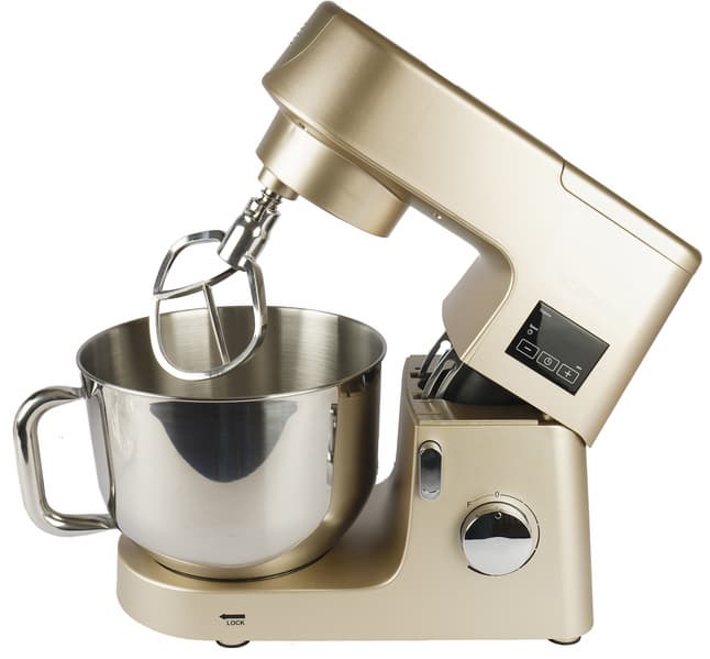 Кухонный комбайн решён в золотистом цвете с металлическими чашей и насадками. Никаких рекламных наклеек и вычурных деталей.