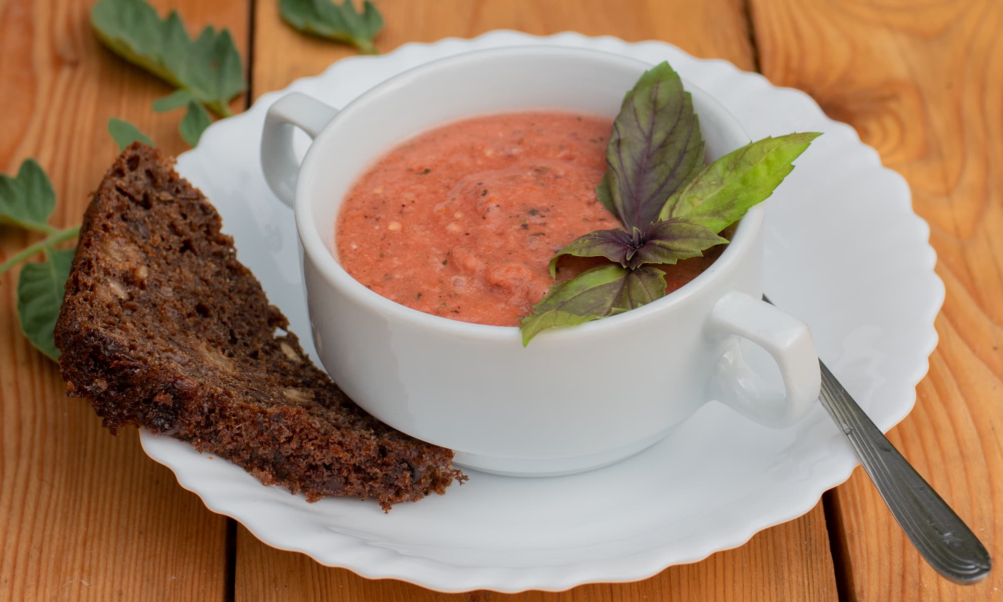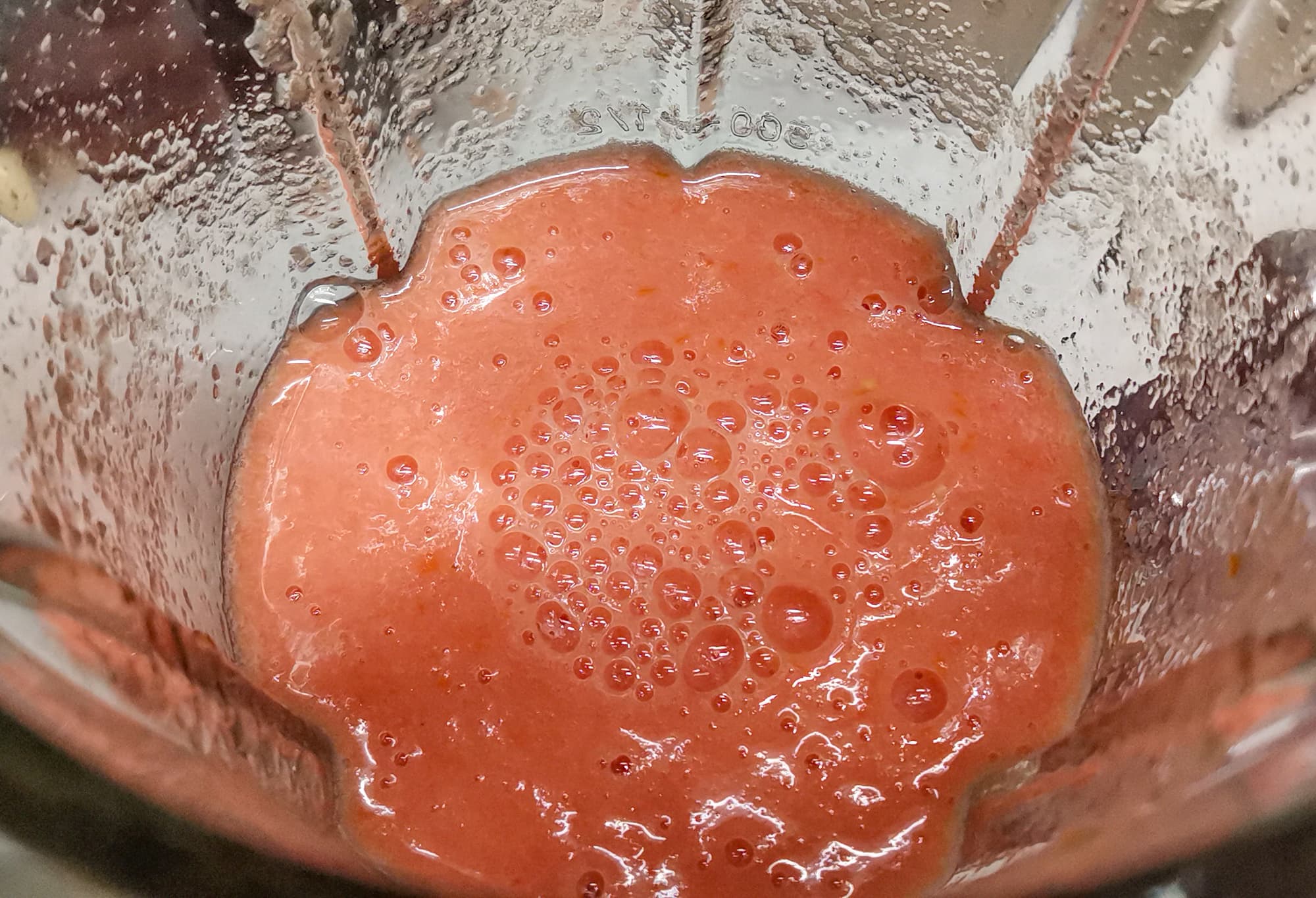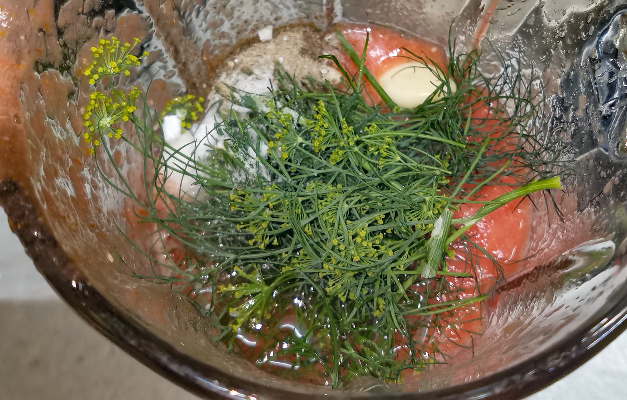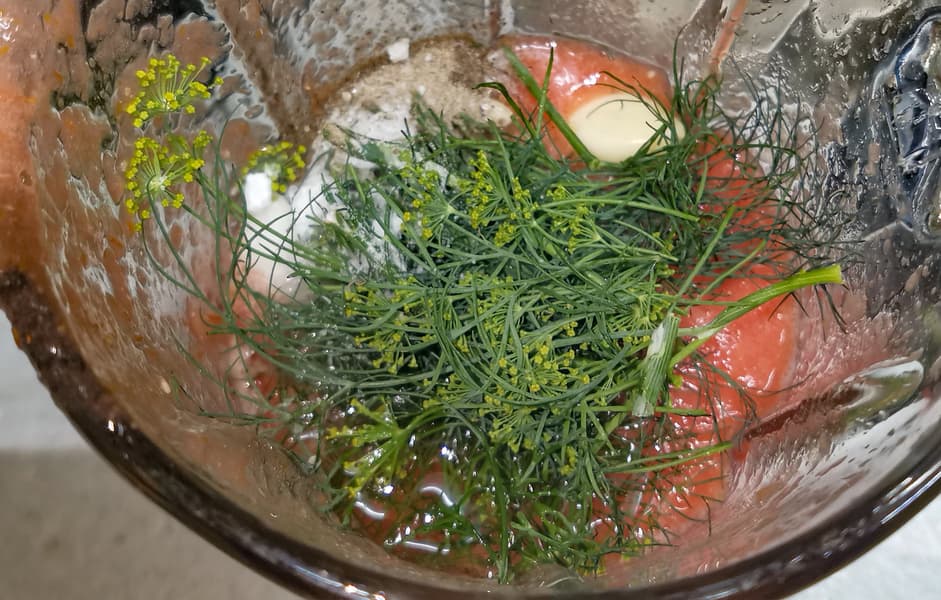 В томатный смузи добавили чеснок, укроп, специи и оливковое масло и измельчили для заготовки под гаспаччо.