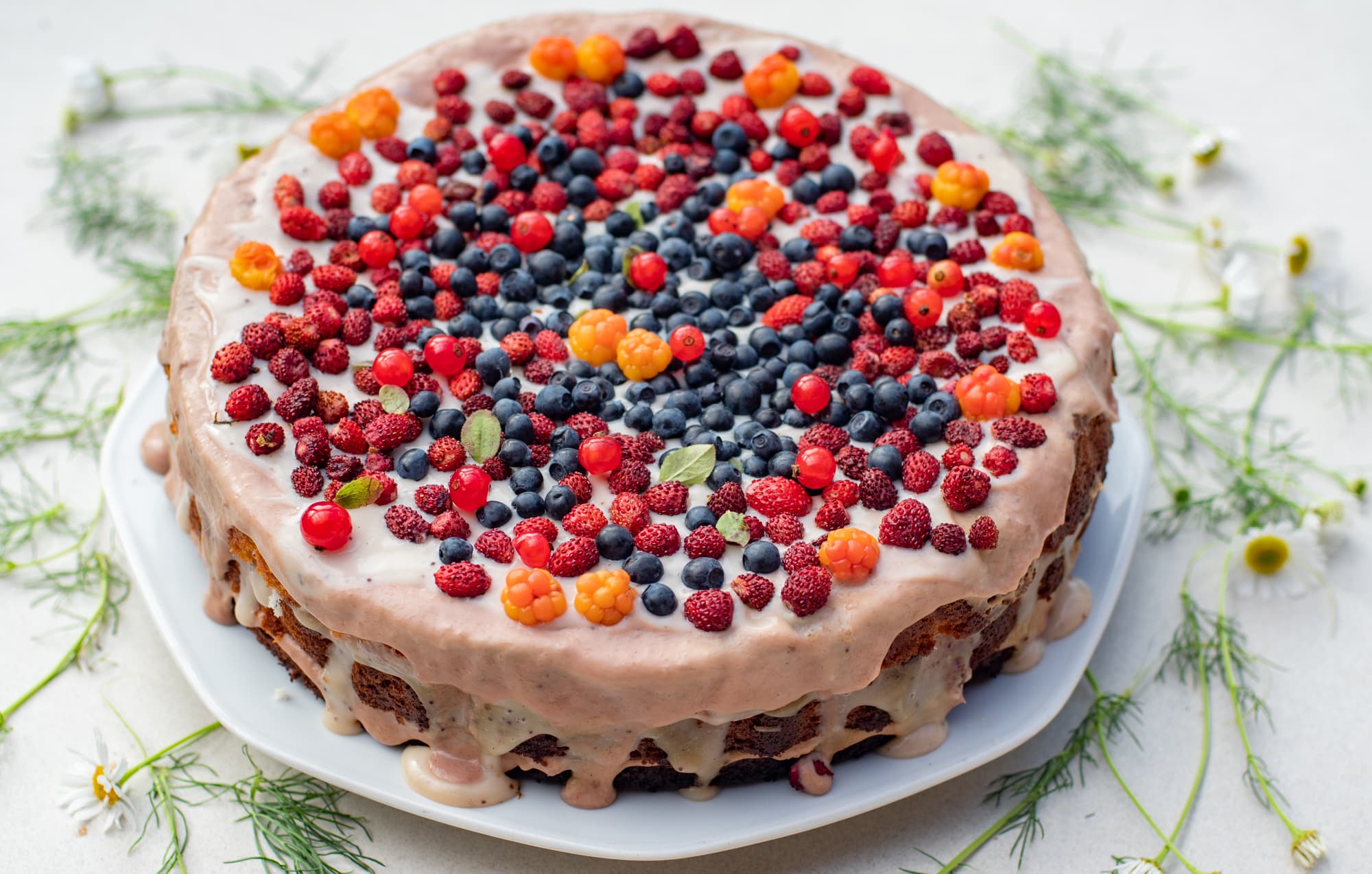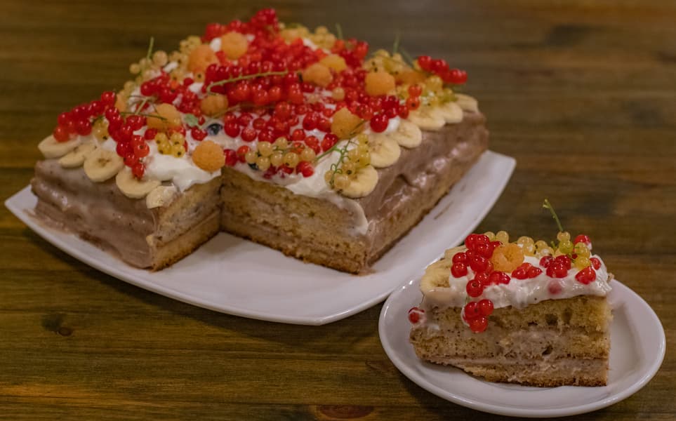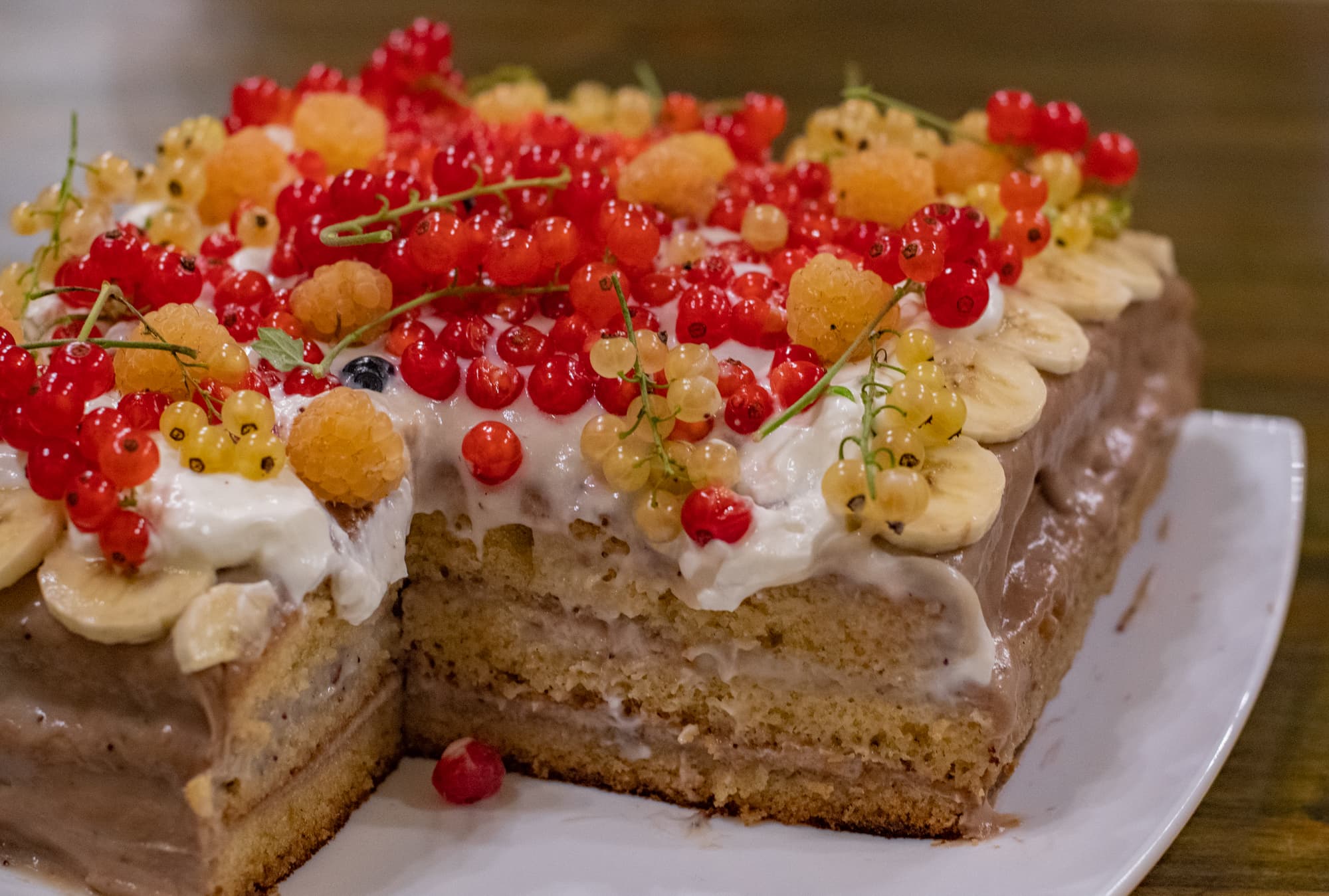 Из крема, коржей и взбитых сливок сформировали торт, украсили бананами и ягодами.