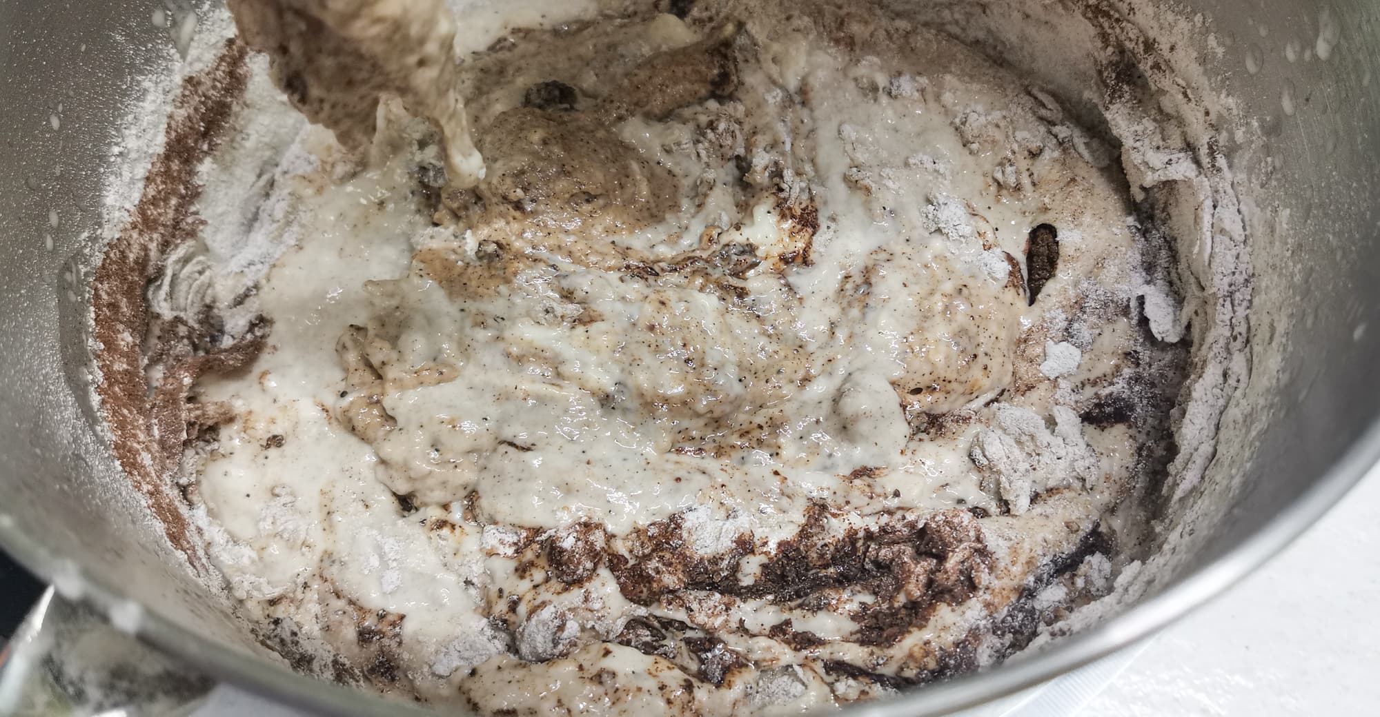 В закваску долили воды, и включив миксер на перемешивание, засыпали в чашу смесь из пшеничной муки, ржаной муки и солода. Поставили вымешиваться на скорости 3.