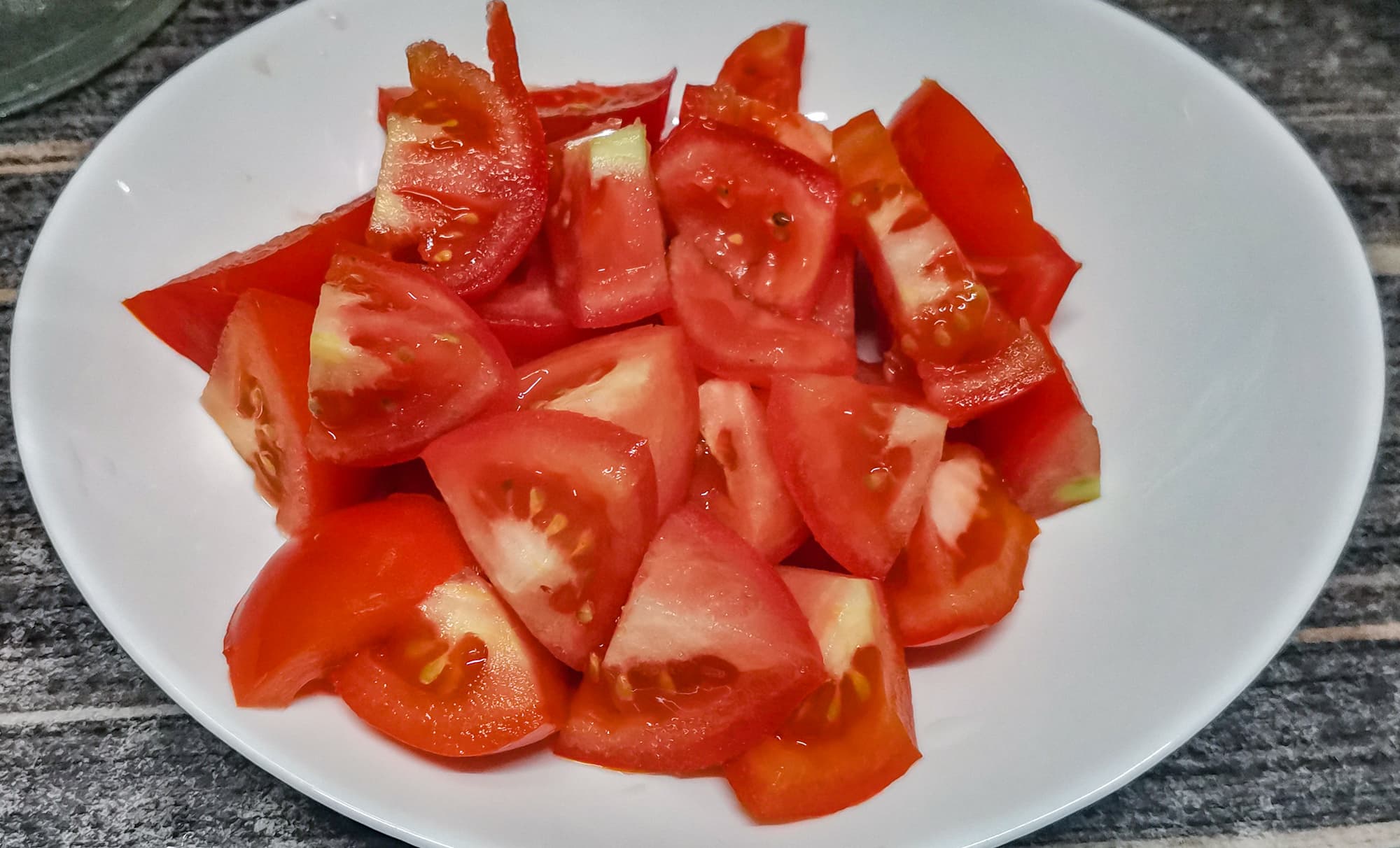 Мы взяли томаты «сливки» с плотной кожицей, произвольно порезали на 4-5 частей, удалили плодоножку.