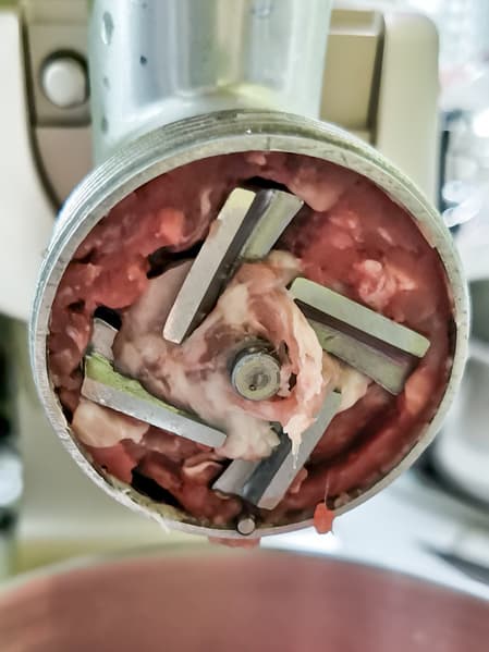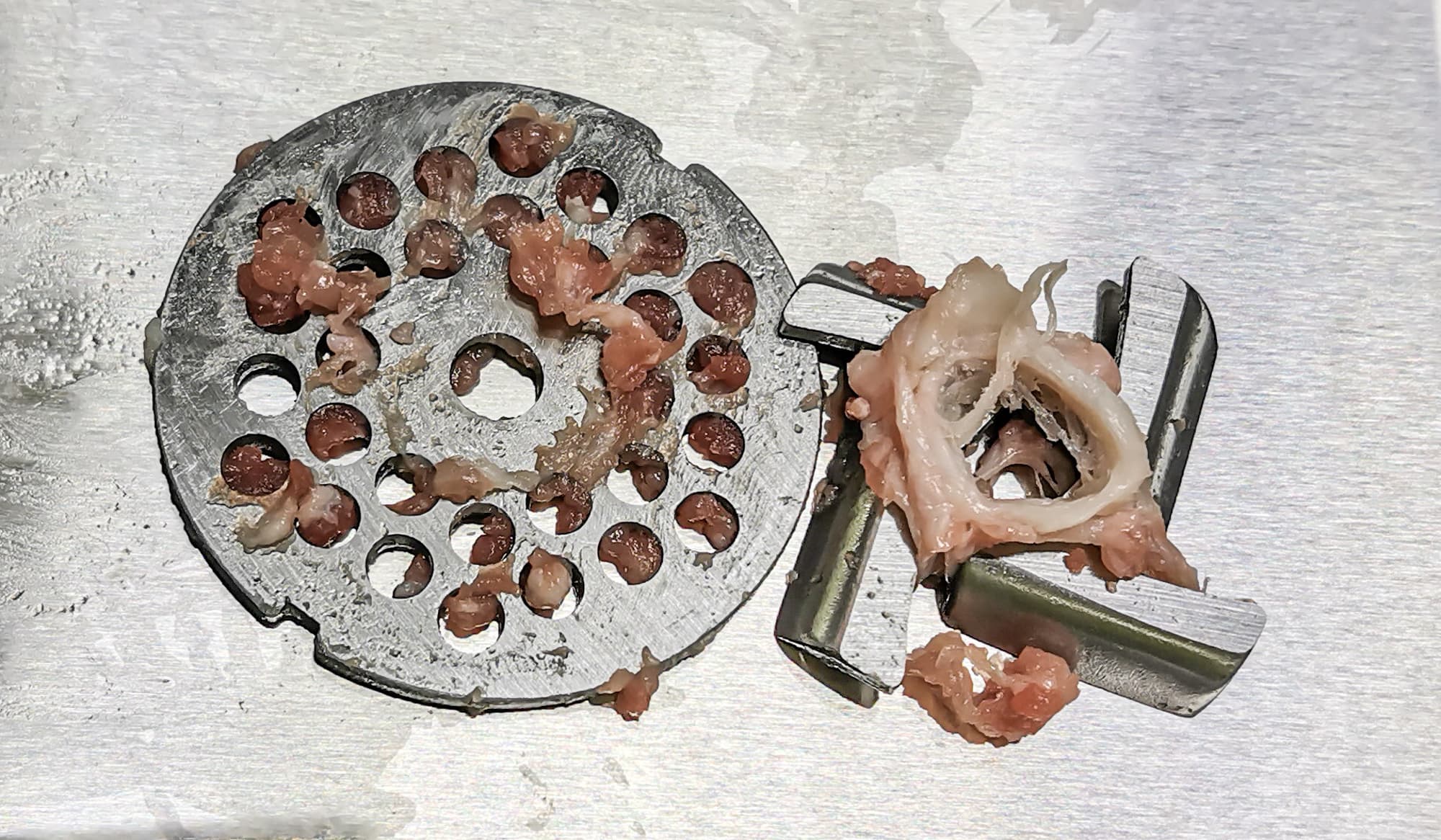 В результате обработки 3 кг свинины на решётку и нож намоталось некоторое количество жилок. Это не мешало ей работать, но в центре решётки, где были жилки, мясо уже скорее не рубилось, а давилось. По краям, где жилки отсутствовали, мясо рубилось.