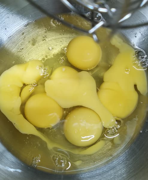 Для цитрусового масляного бисквита мы взбили яйца с сахаром до устойчивой пены. Это заняло около 6 минут, взбивали венчиком сначала на 4, затем на 6 скорости.
