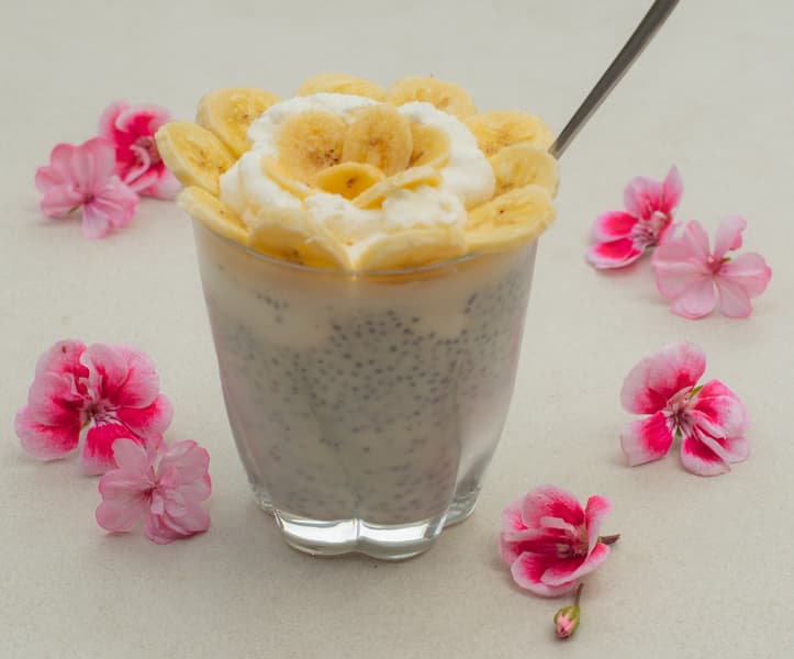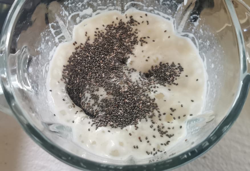 В получившуюся воздушную смесь добавили семян чиа и перемешали на скорости 1 за 4-5 секунд. Перелили в ёмкость, поставили в холодильник на пару часов для набухания семян.