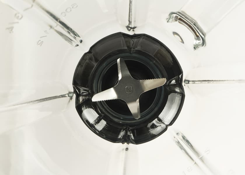 Чаша блендера стеклянная объёмом в 1,5 л. На стенках есть мерная шкала. Блок крепления ножей у прибора пластиковый, открутить нам его не удалось. Поскольку в инструкции не указано, что блок разборный, сильно усердствовать мы не стали, боясь сломать прибор.