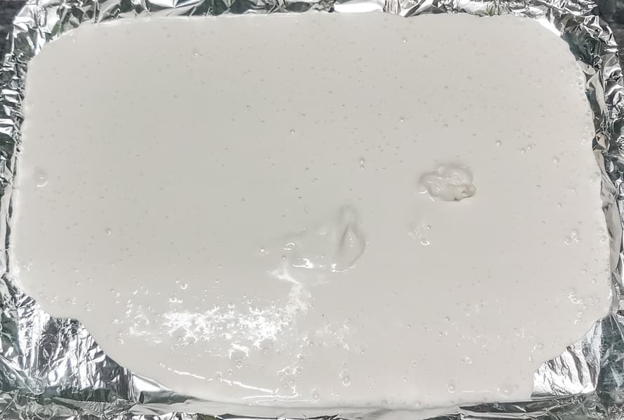 Получили пышную белую массу, которую переложили на подготовленную поверхность для застывания.