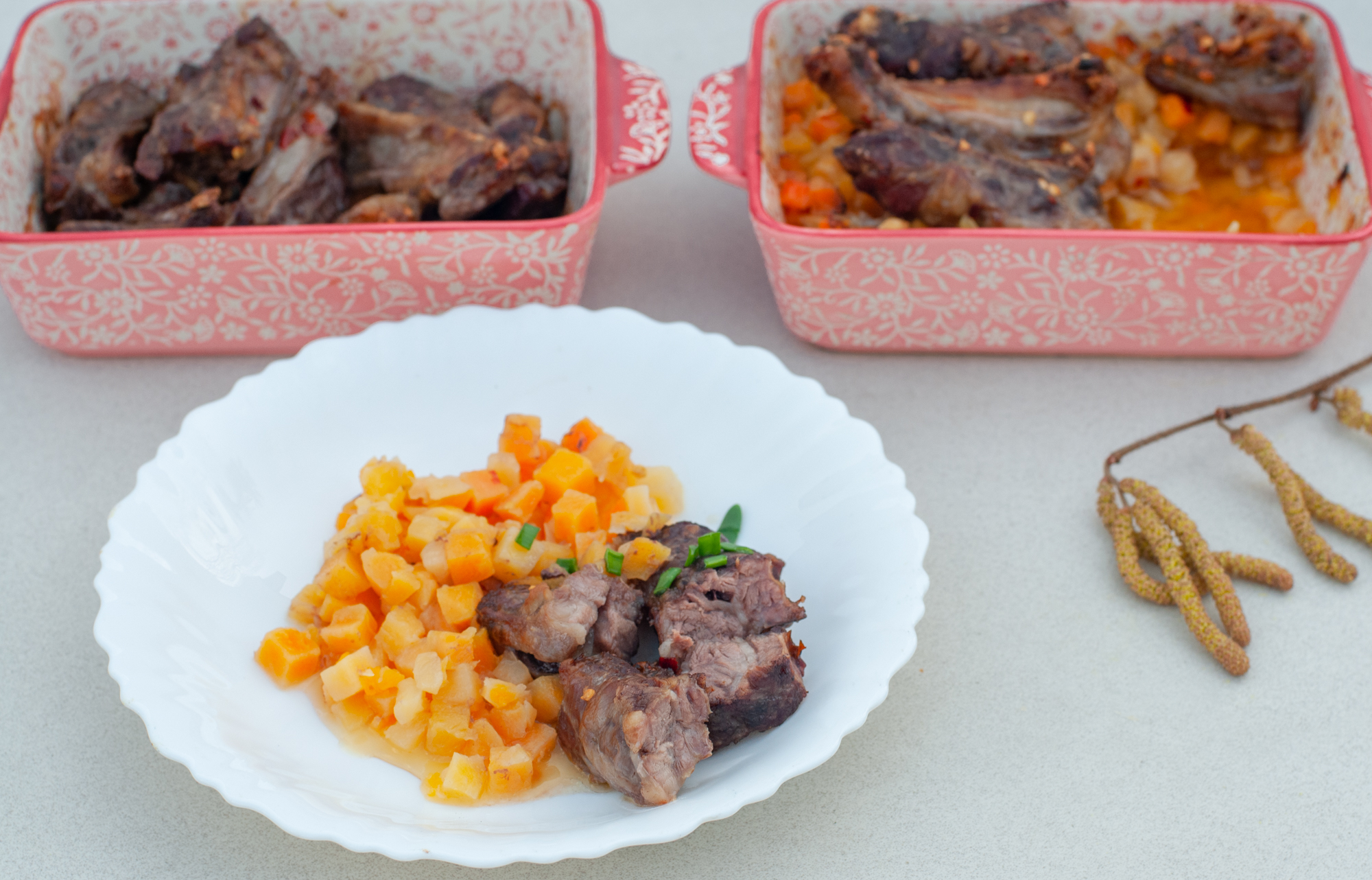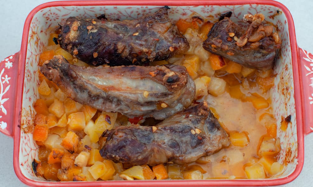 Для запеченной говядины мы использовали межреберное мясо и замороженную тыкву. Тыкву выложили, не размораживая, в керамические емкости, уложив на нее куски мяса, посыпанные специями с солью.