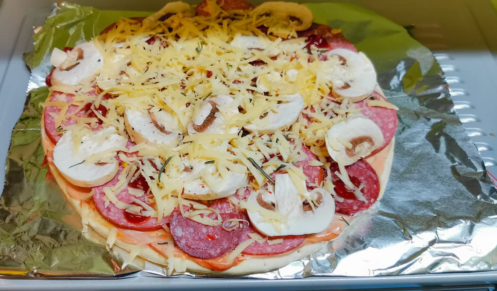 Основу разморозили в Starwind SMO2002, смазали ее соусом из томатной пасты и майонеза, положили сверху все ингредиенты, пересыпая их сыром и специями.