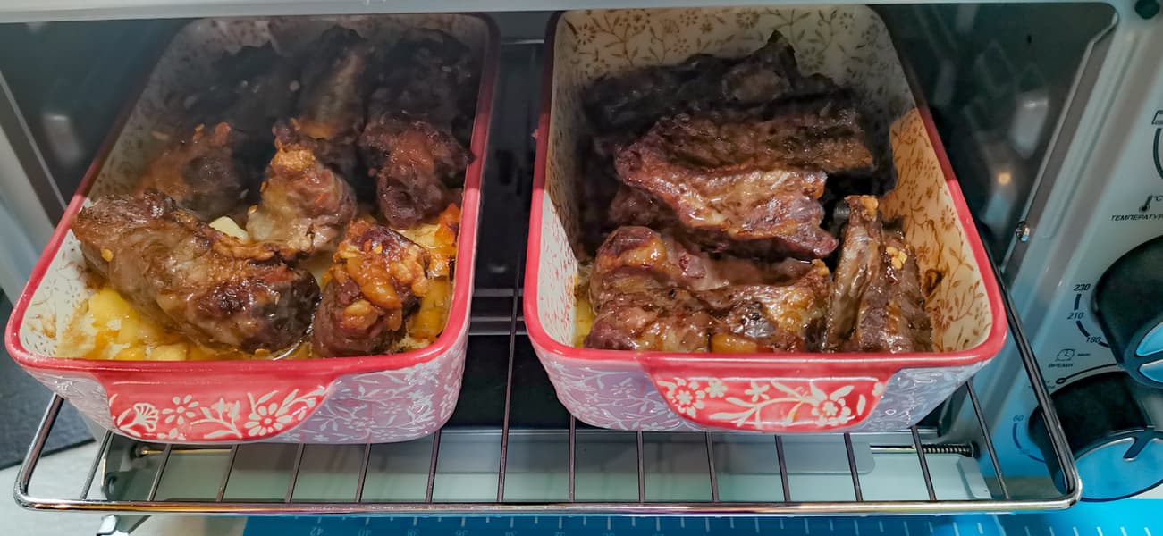 Поставили емкости на решетку, выставили температуру 200 °C, нижний и верхний нагрев. Запекали до готовности.