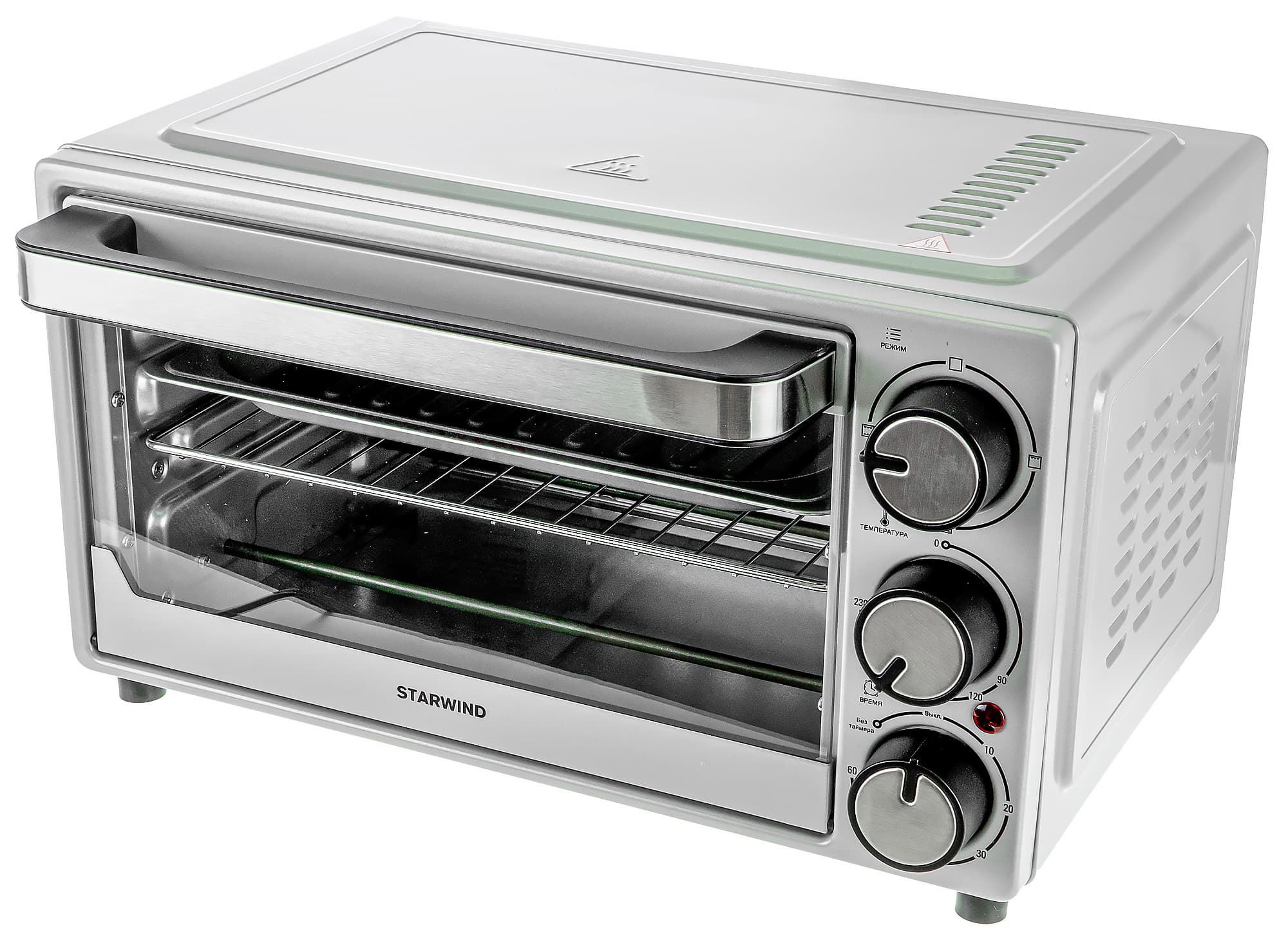 Всего у Starwind SMO2002 три уровня для установки поддона и решетки, причем поддон должен быть установлен обязательно, для того, чтобы пища случайно не попала на тэны. Таким образом, для установки решетки остается только 2 уровня над поддоном.