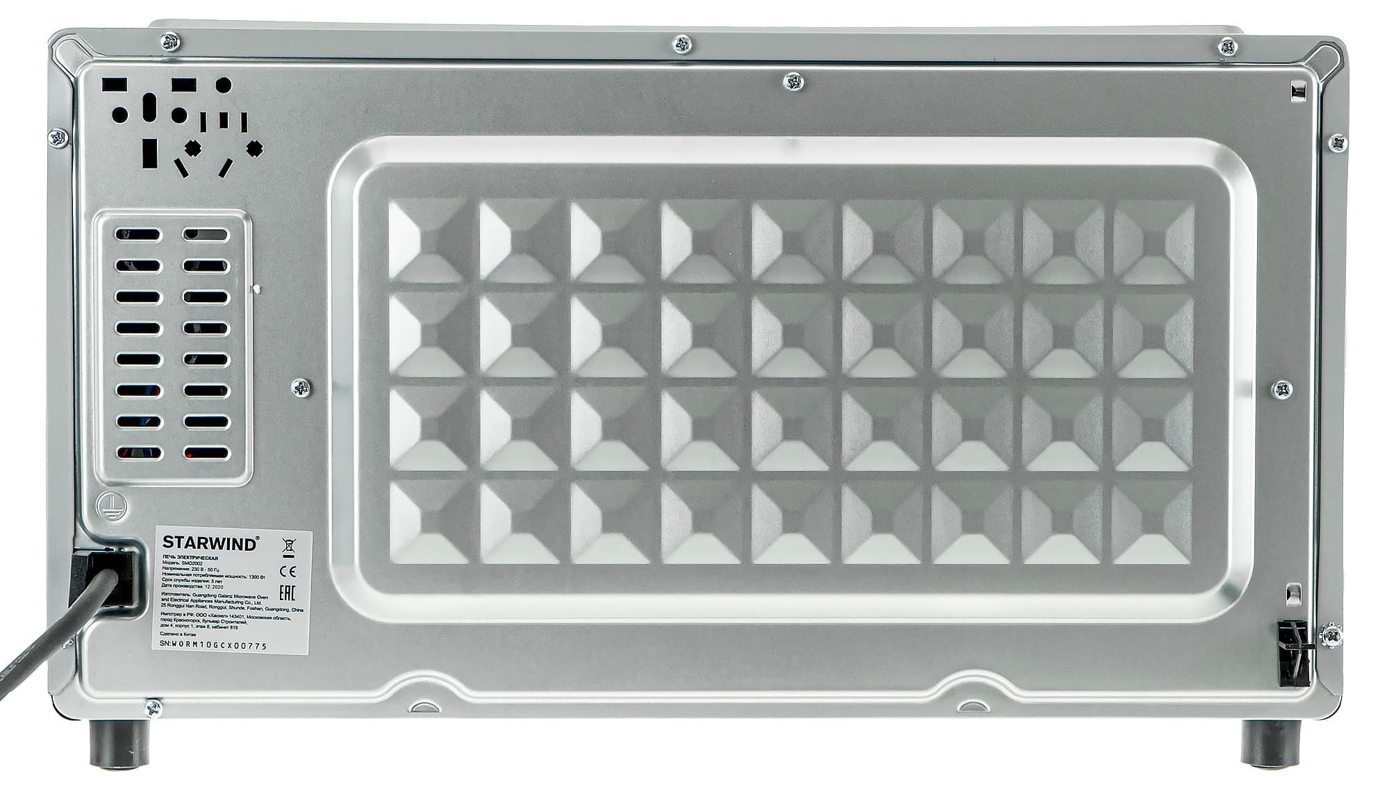 Сзади, кроме вентиляционных отверстий, около выхода шнура питания находится наклейка с техническими данными прибора.