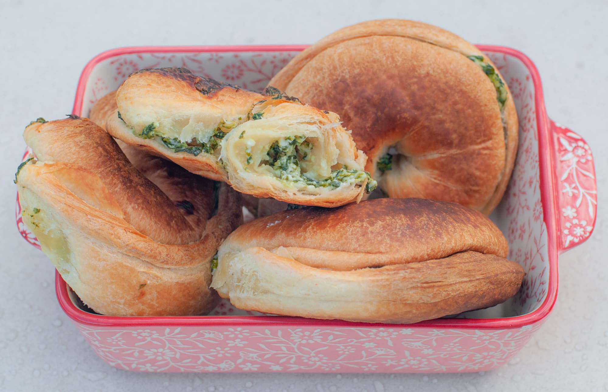 Взяли недорогое слоеное дрожжевое тесто, разморозили, нарезали на прямоугольники. Для начинки использовали резанный шпинат из заморозки, смешанный с плавленым сыром «Янтарь». Положили начинку, закрутили улитки, выложили на решетку на фольгу. Выставили 215 °C на 20 минут, нижний нагрев. После еще на 15 минут 230 °C верхний и нижний нагрев. Вынули, подали.