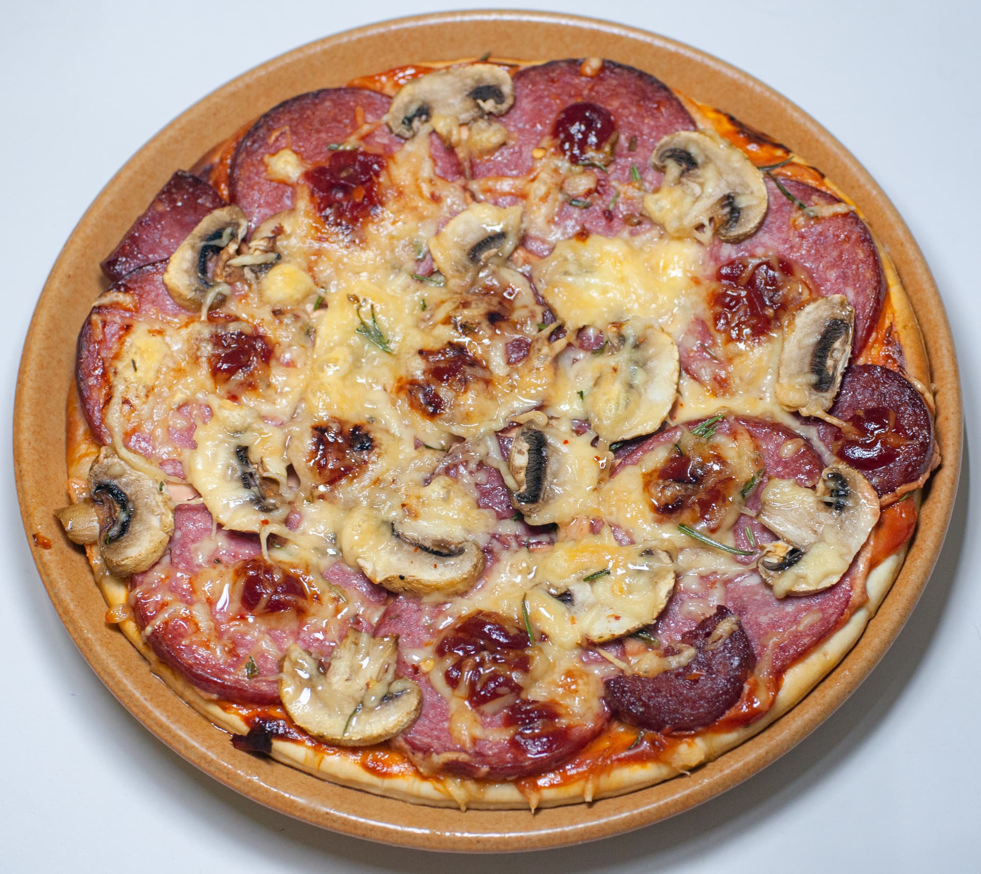 Для пиццы мы взяли готовую замороженную основу, колбасу, сыр, соус, грибы и специи.