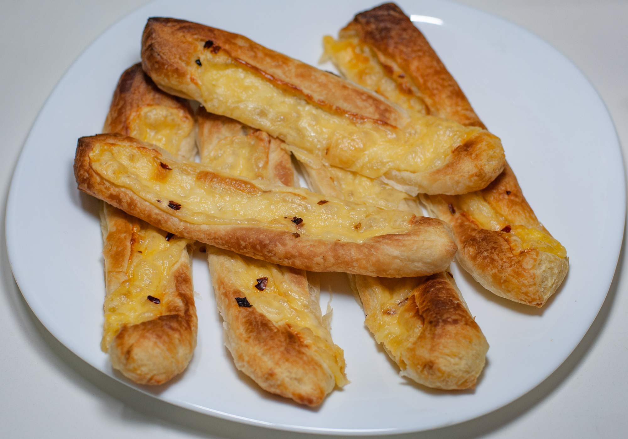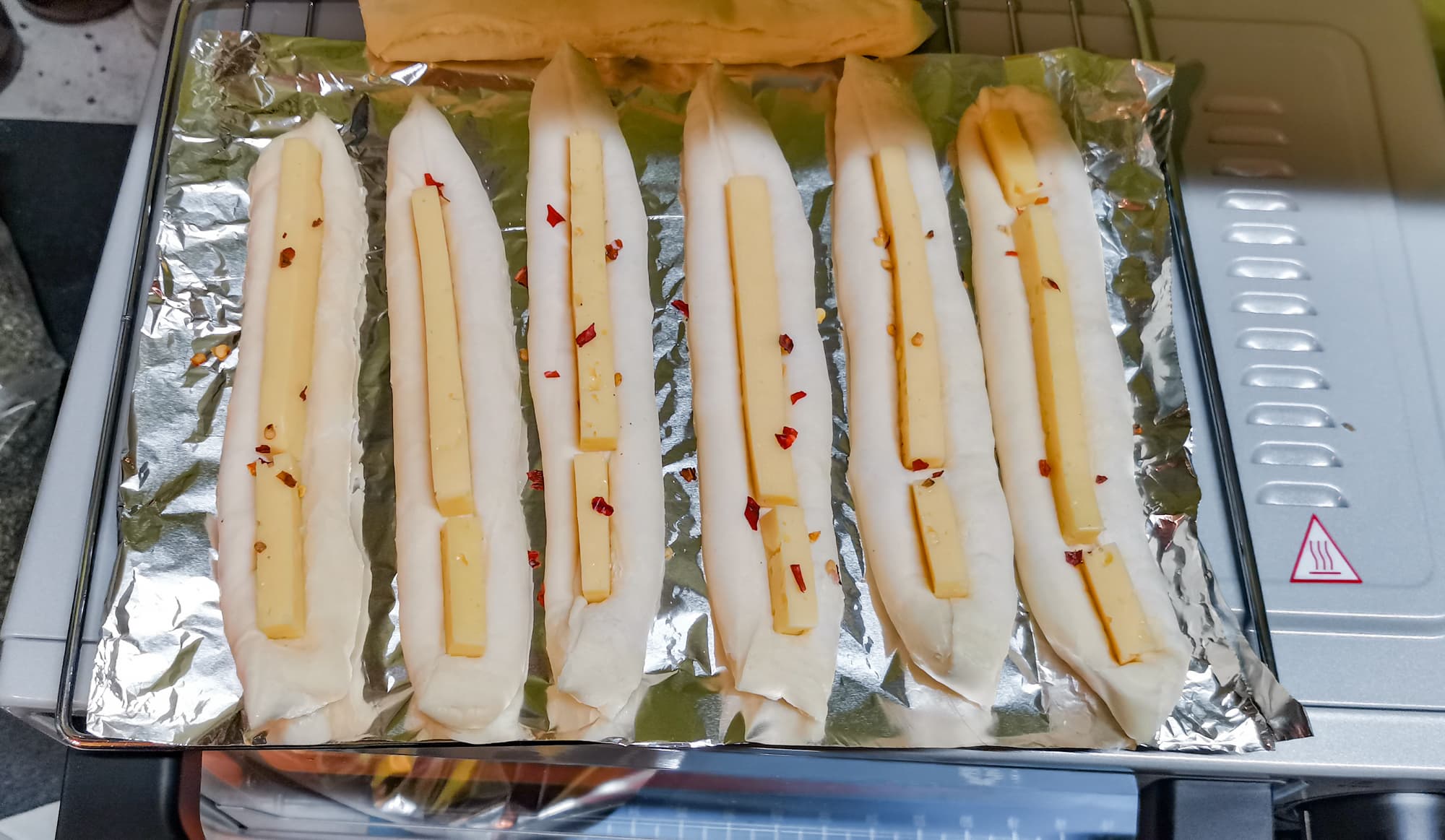 Мы взяли замороженное слоеное бездрожжевое тесто нижнего ценового сегмента. Разморозили, нарезали на полоски, в каждую положили по кусочку сыра с солью и острым перцем. Выложили на решетку на фольгу. Выставили 215 °C на 15 минут, нижний нагрев. Затем еще 10 минут верхний нагрев.
