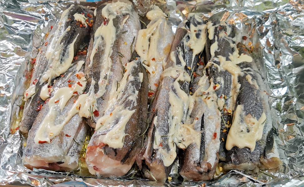 Мы взяли тушки замороженного хека. Разморозили, натерли солью, специями, сбрызнули лимоном. Выложили на противень, обернутый фольгой. Сверху смазали майонезом, снизу положили немного масла, посыпали специями. Выставили среднюю температуру, нижний нагрев.