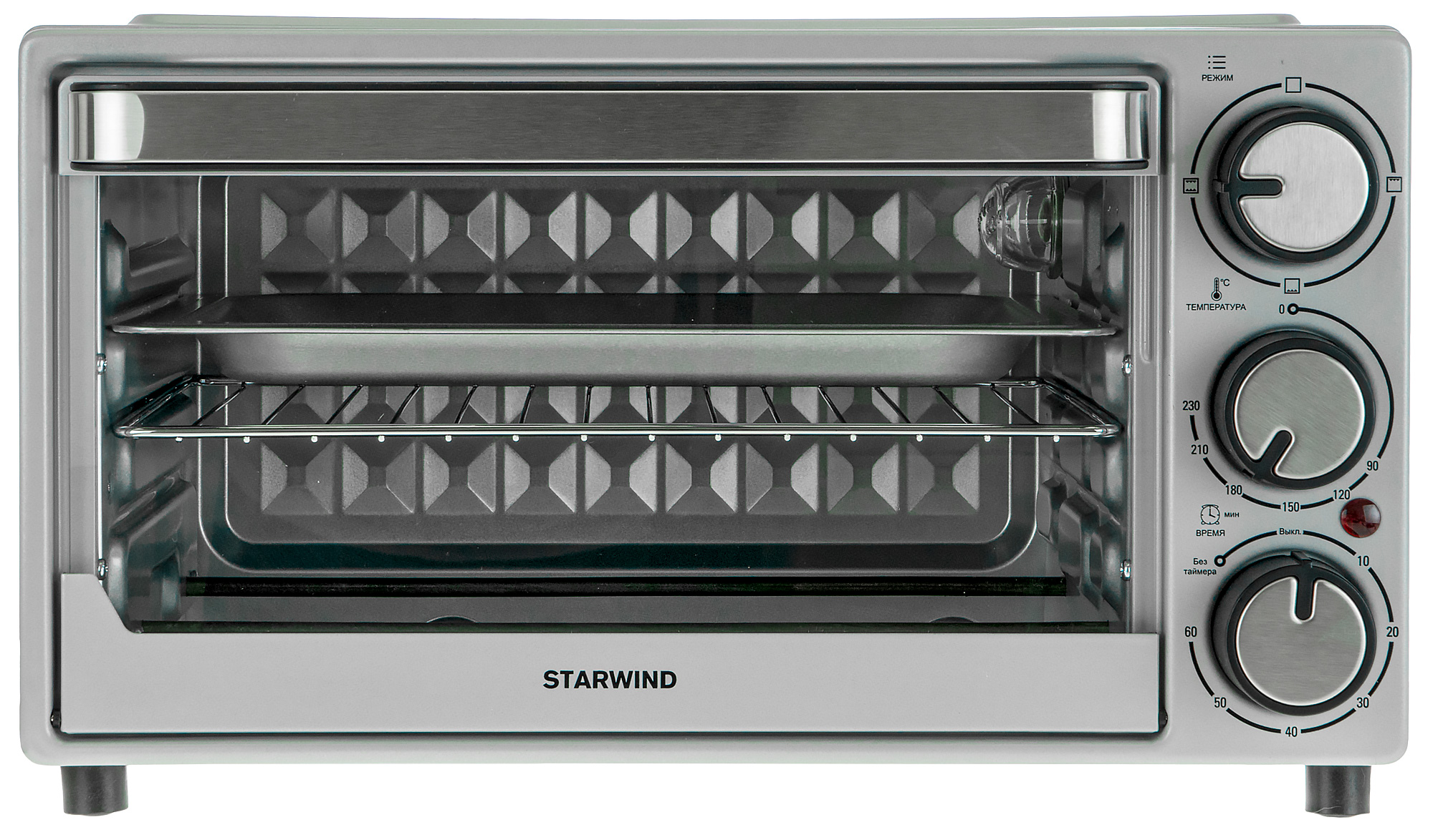 На лицевой стороне Starwind SMO2002 находятся 3 механических переключателя и индикатор работы. Верхний переключатель отвечает за режимы работы: верхний нагрев, нижний нагрев, верхний и нижний нагрев, выключено.