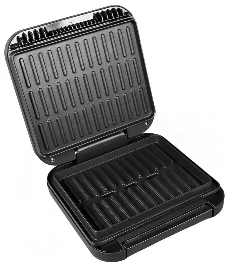 Панели с антипригарным покрытием не снимаются, имеют характерные объемные полосы и плотно соединяются, когда крышка закрыта, благодаря бортикам по периметру. На случай жарки особо крупных кусков в конструкции предусмотрен люфт, чтобы крышка закрылась.