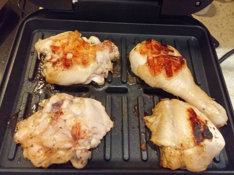 Мы разделали и замариновали курицу в специях и соевом соусе на 1 час. Чтобы пожарить все кусочки и накормить 4 взрослых человек, нам понадобилось всего 3 захода на гриле. Крышка позволила накрыть и покрыть аппетитными полосками даже крупные ножки курицы, а грудка была восхитительно нежной и сочной на вкус. Курица выделила много воды и жира, которые дружно стекли в поддон, создавая впечатление диетического блюда. Каждой партии требовалось 10 минут для прожарки, а особо крупные куски «доходили» еще по 2 минуты при включенном гриле.