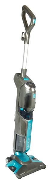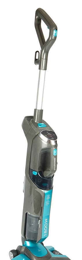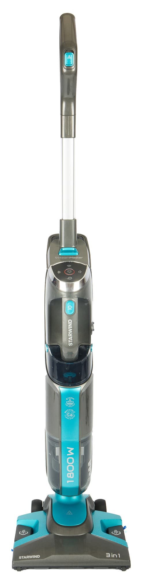 Корпус у Starwind SSV9550 серо-стальной с бирюзовыми декоративными элементами. Его конструкция традиционна для вертикальных паровых пылесосов: удлинительная ручка с дублирующими элементами управления, съемный блок парогенератора, моторный блок пылесоса с мусоросборником и единственная насадка для влажной и сухой уборки пола, заодно служащая устройству опорой.