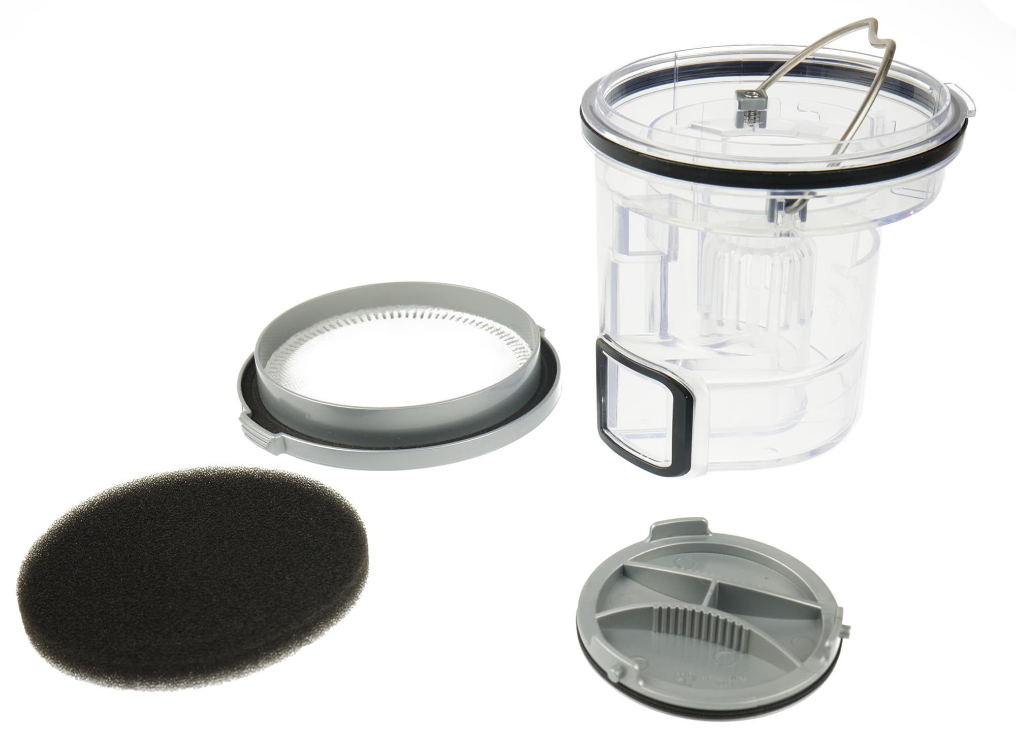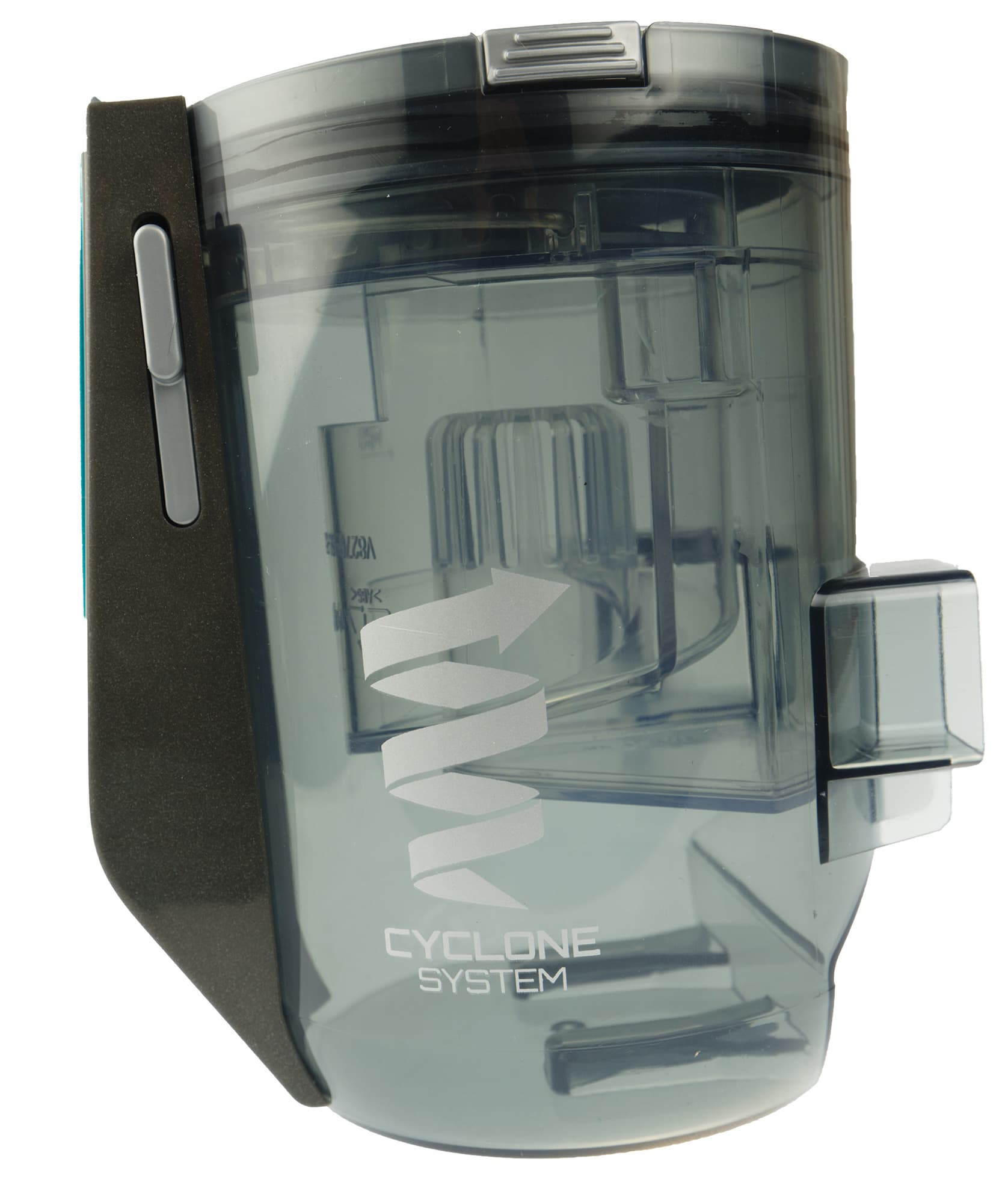 Втянутый пылесосом поток воздуха попадает в циклонный фильтр мусоросборника, где закручивается против часовой стрелки, поднимаясь вверх. Крупный и тяжелый мусор при этом выбрасывается центробежной силой через отверстия в верхней части циклона и оседает в контейнере. Мелкая пыль проходит через центральные отверстия и поступает на фильтр тонкой очистки.