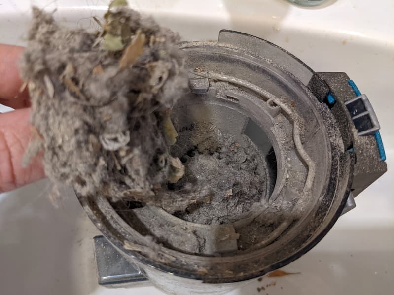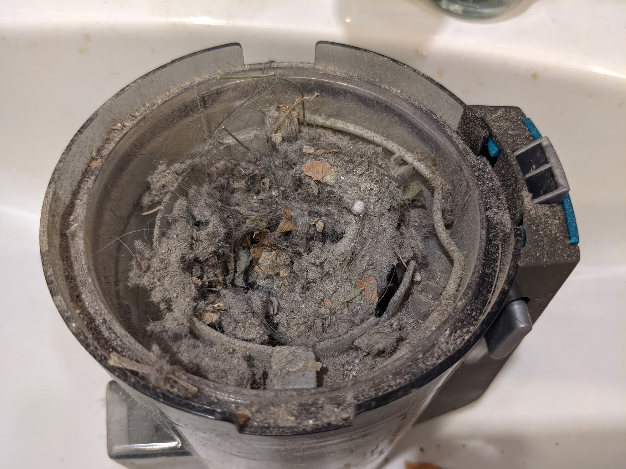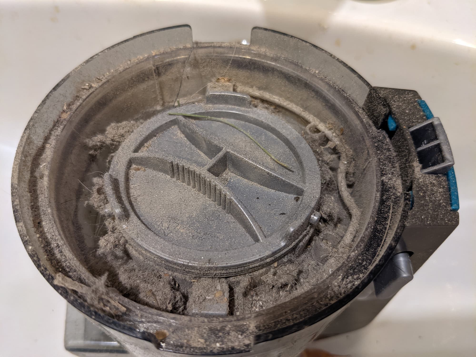 Больше половины собранного мусора скопилось в верхней части центральной трубки, образовав труднопроходимую пробку: судя по всему, конструкция циклона рассчитана на более мощный поток воздуха и тяжелый мусор не отбрасывается в сторону и вниз, как задумано, а поднимается к фильтру тонкой очистки, где и остается.