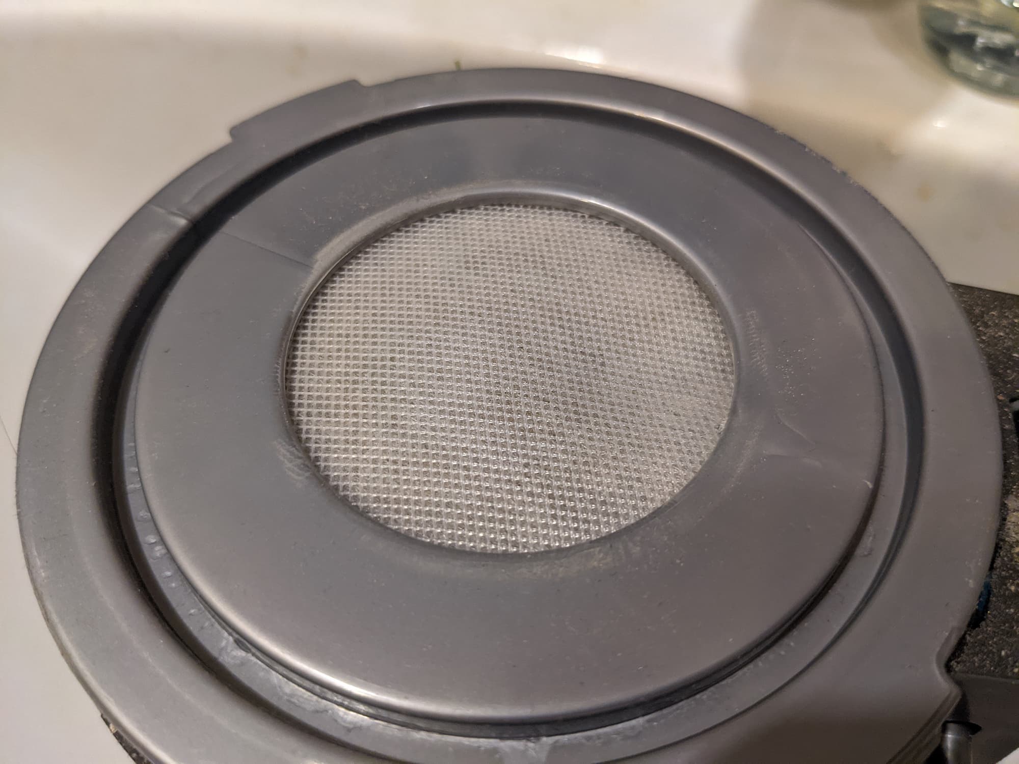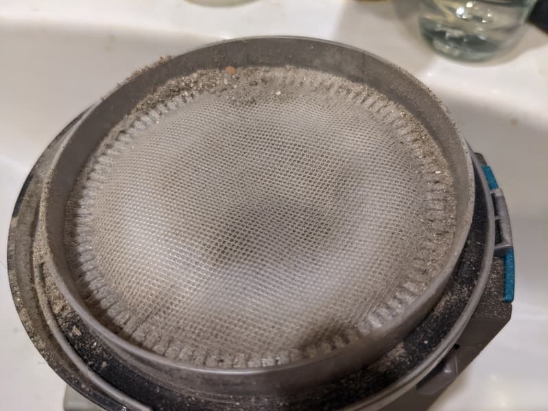 На внешней поверхности фильтра тонкой очистки заметны следы пыли, прошедшей сквозь него: систему фильтрации пылесоса сложно назвать эффективной.