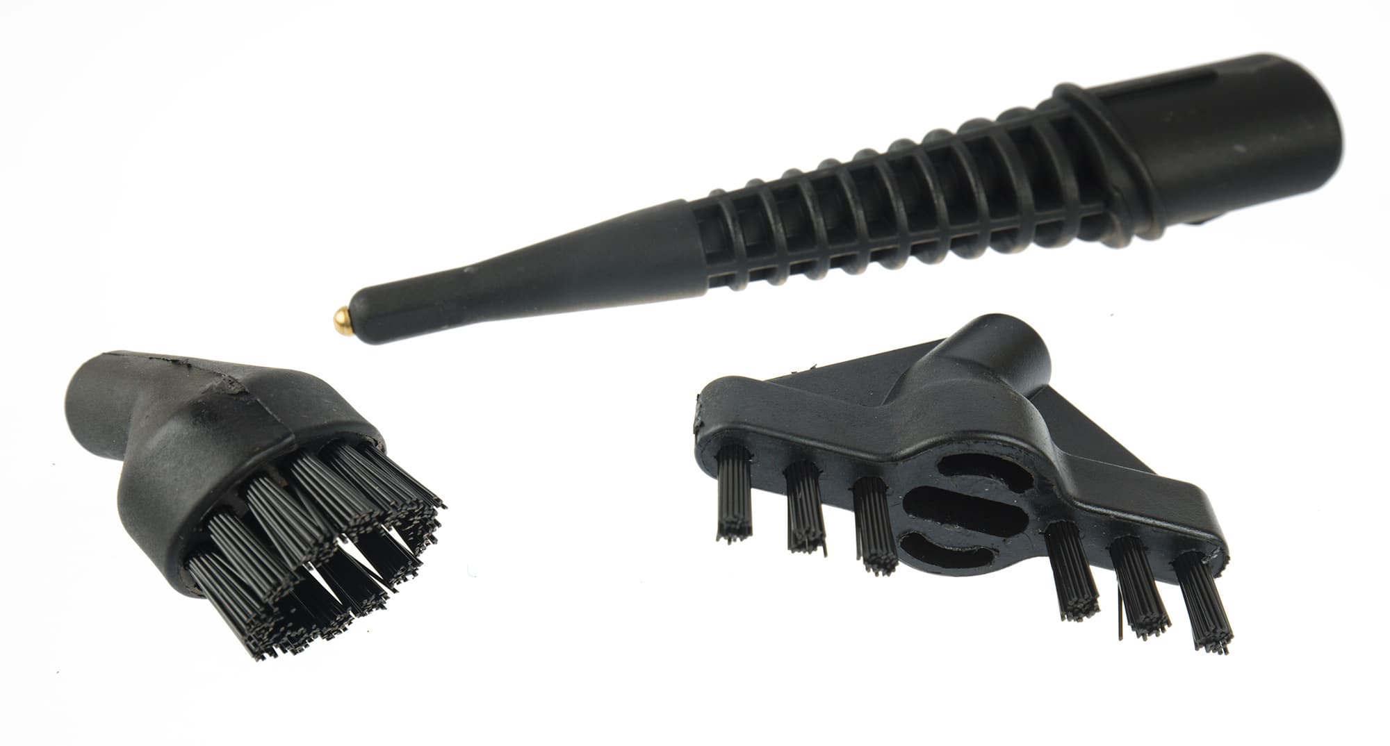 К выходному штуцеру парогенератора в ручном режиме присоединяется струйная насадка. На нее можно крепить дополнительные щетки: плоскую для чистки швов между кафельной плиткой и круглую — для всех остальных работ.