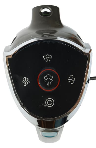 На правом боку парогенератора — круглый тумблер, включающий нагрев. Кнопка подачи пара находится на рукоятке прибора, под большим пальцем оператора. Панель управления расположена на верхнем торце (мы рассмотрим ее подробнее чуть ниже).