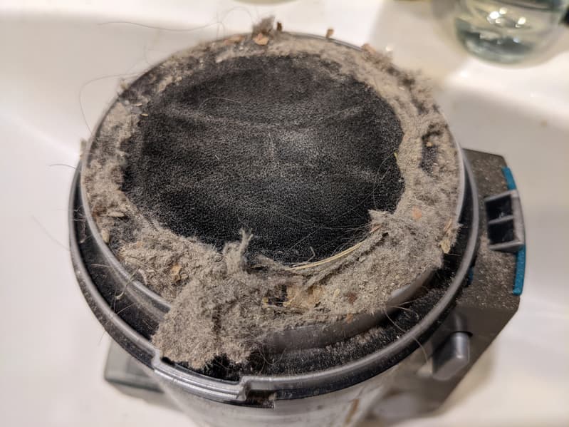 Крупный мусор замечен даже по периметру поролонового фильтра тонкой очистки. Мусорная пробка еще сильнее уменьшает мощность пылесоса и качество уборки снижается.