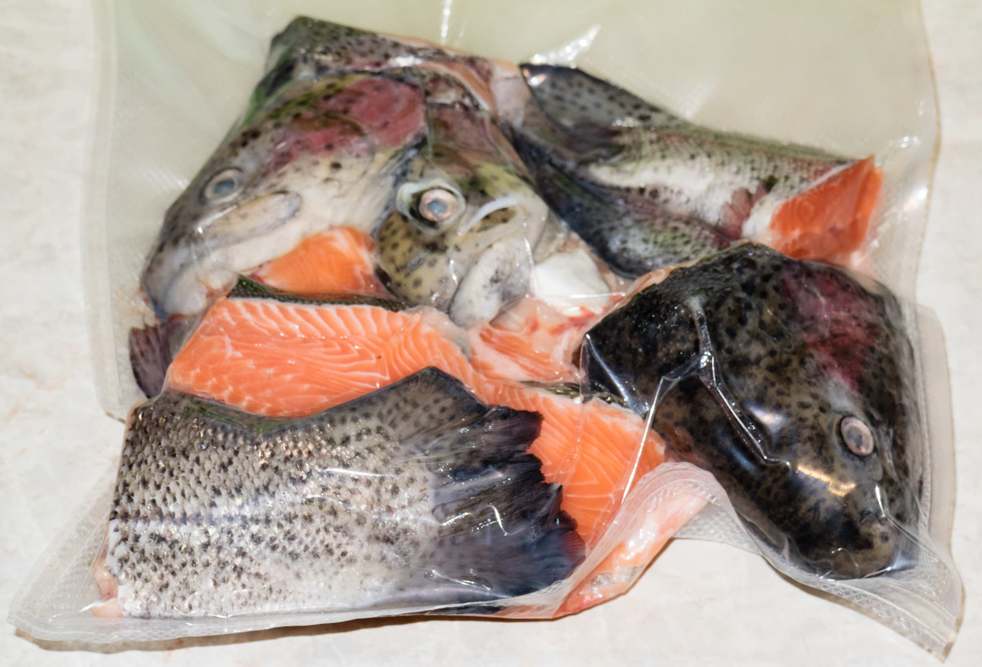 Остатки рыбы после очистки и снятия филе — головы, хвосты, обрезки и хребет — было решено заморозить для дальнейшего использования. Для упаковки использовали пакет большого размера, т. к. вес «отходов» от разделывания трех тушек форели составил 1,4 кг.
