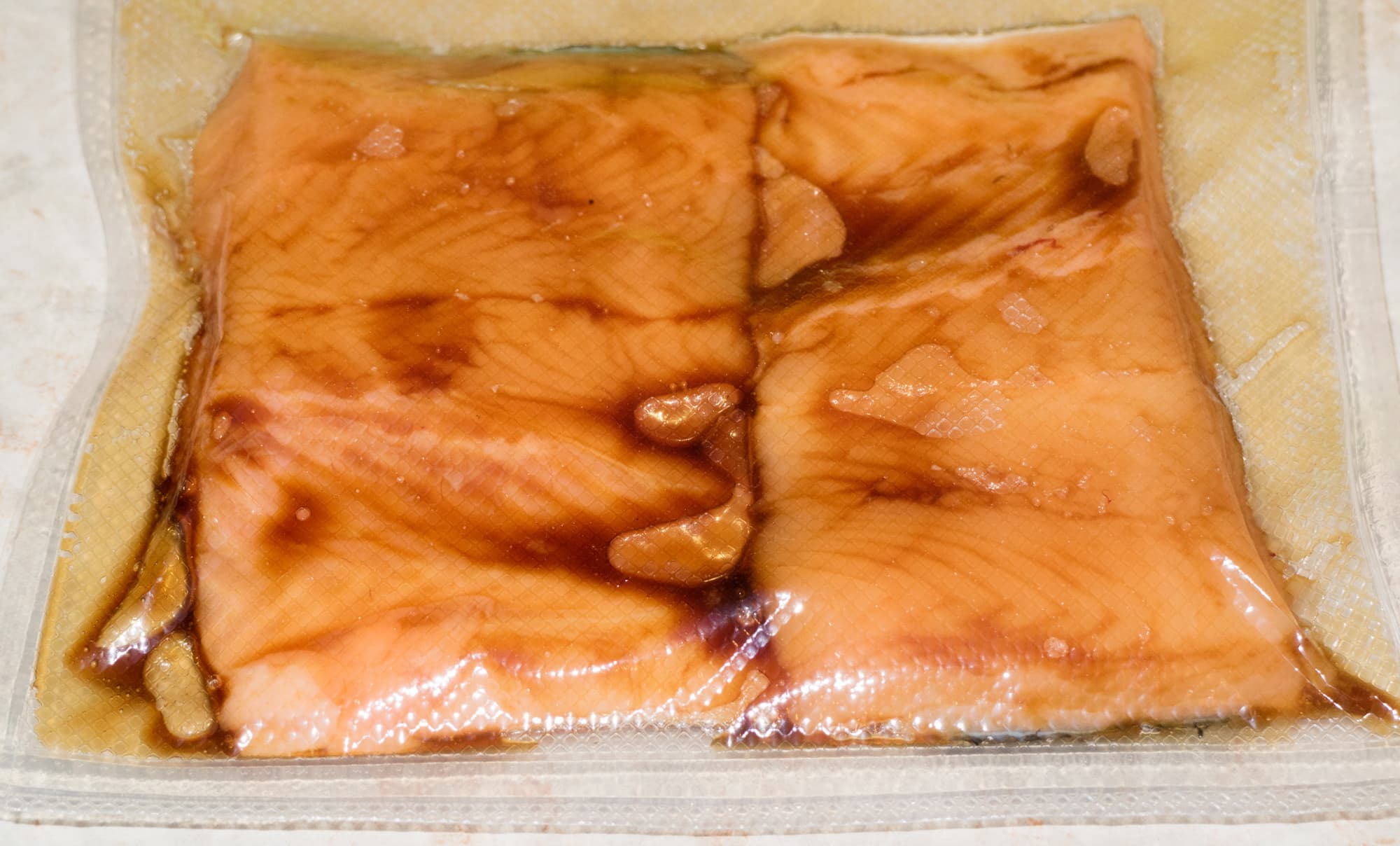 Подготовленную рыбу разделали на стейки и обмазали терияки, затем попытались вакуумировать. В данном опыте мы столкнулись с проблемой, которую описали в разделе «Эксплуатация», поэтому одну порцию мы упаковывали, слегка промокнув излишки соуса, а вторую — с использованием функции ручной вакуумной упаковки.